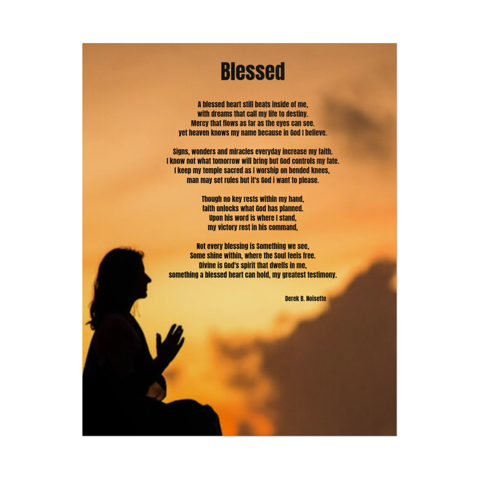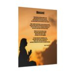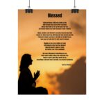 The artwork features a woman in a reverent praying position with a palm above her, symbolizing faith, surrender, and the sacred covering of God’s presence. Beneath the artwork rests the full poem “Blessed,” a powerful reflection on love, gratitude, and the profound gift of a faithful woman. Whether placed in a bedroom, prayer space, living room, or quiet reading corner, this poster invites contemplation on the miracles that love and faith can bring into our lives.