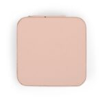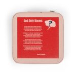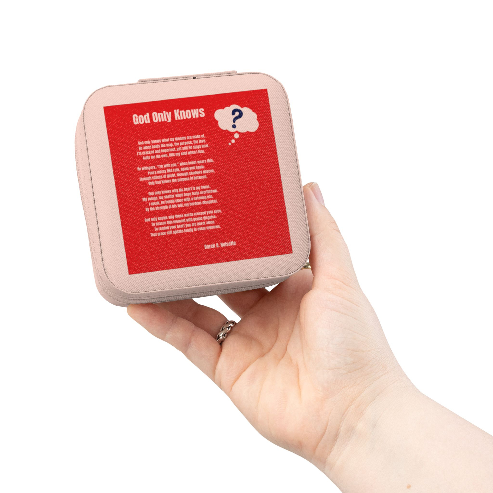 A compact, softly lined jewelry travel case crafted to keep your most delicate pieces protected, and your spirit encouraged, wherever life leads. The square PU leather exterior opens with a secure zip-around closure to reveal four divided compartments, cushioned ring rolls, and three necklace hooks tucked beneath a slim pocket. Earrings, rings, studs, and chains stay separated and tangle-free, while the plush interior gently cushions metals and gemstones against scratches. Its small 4” x 4” x 2” footprint slips effortlessly into a purse, carry-on, or weekend bag, making it perfect for both travel and daily devotion.