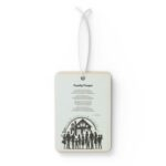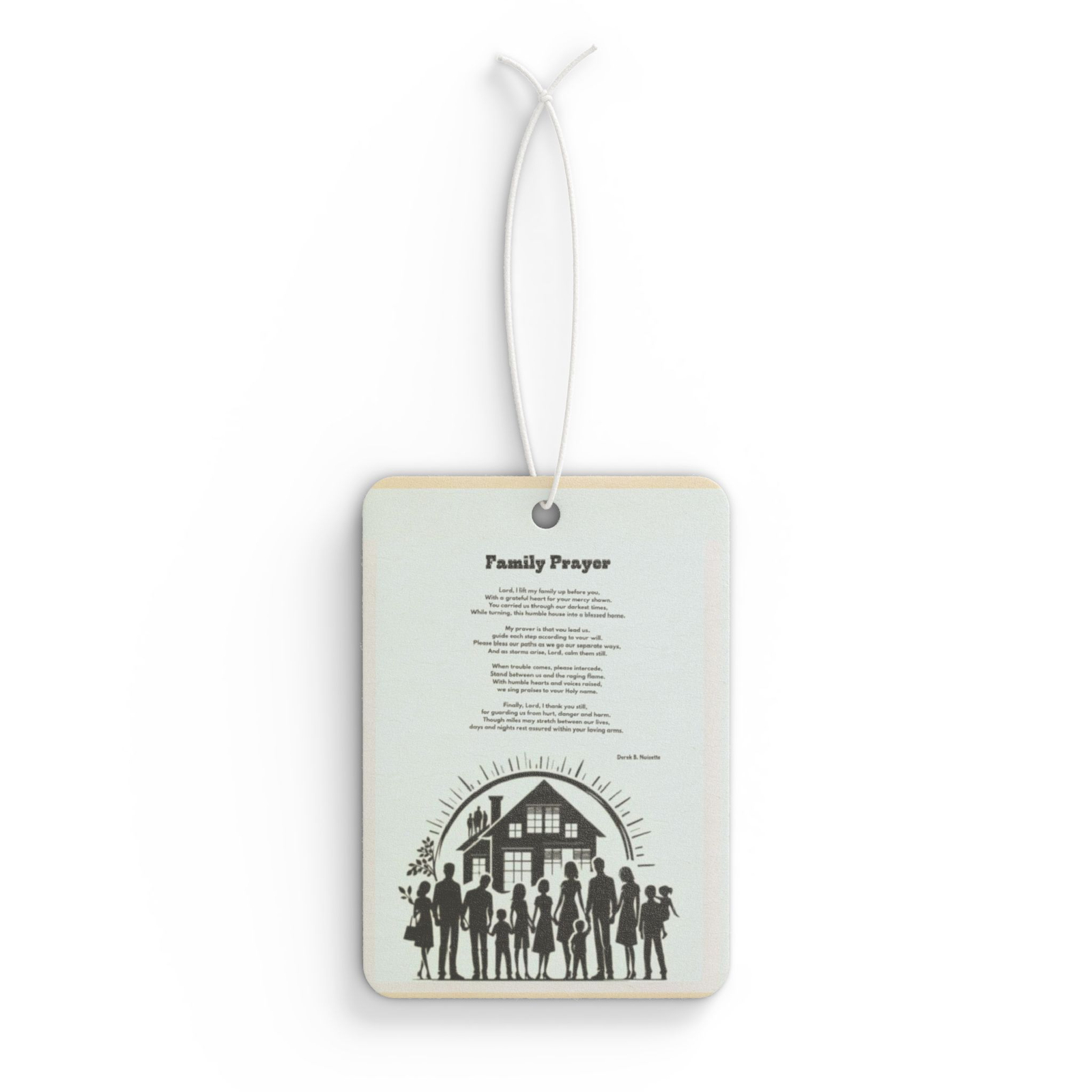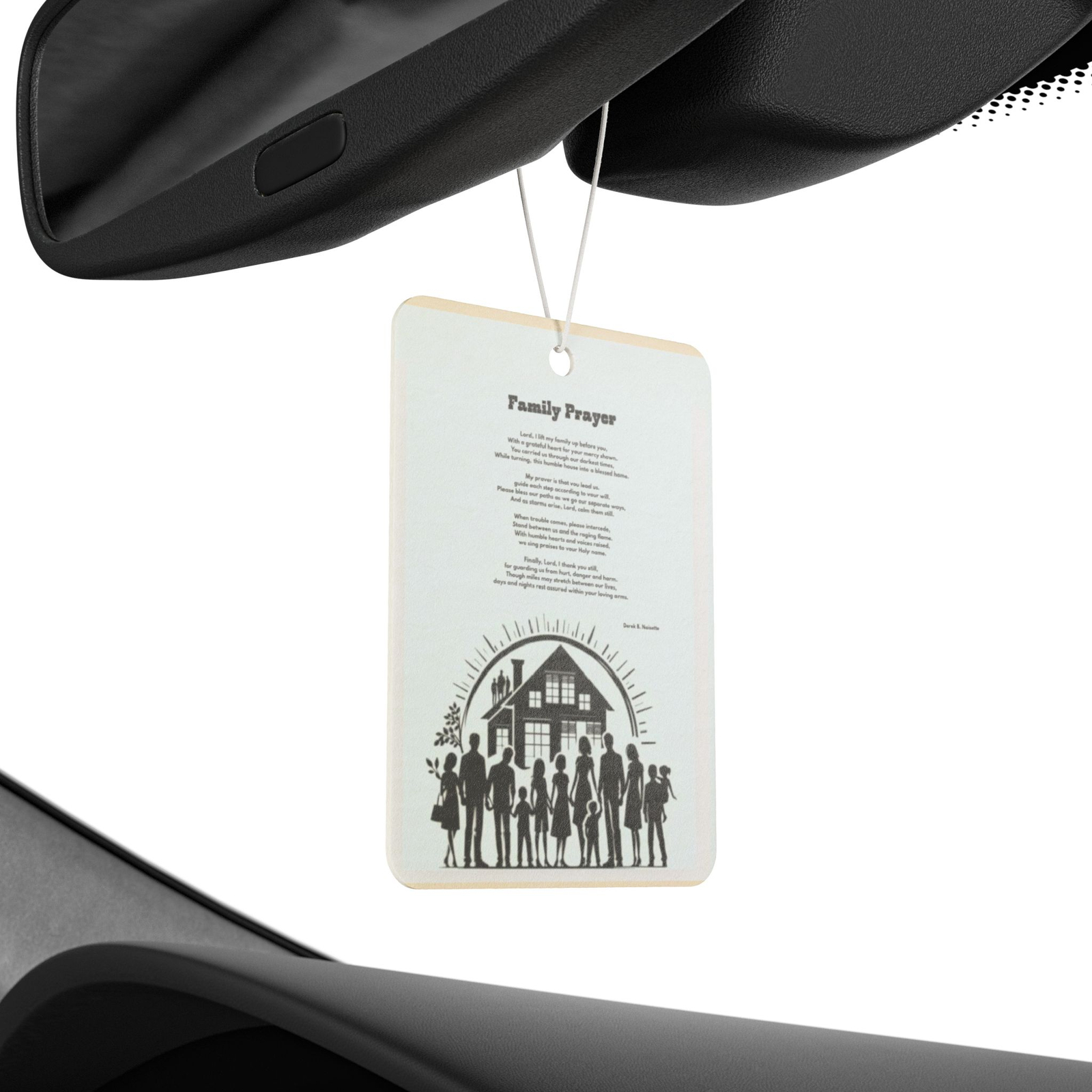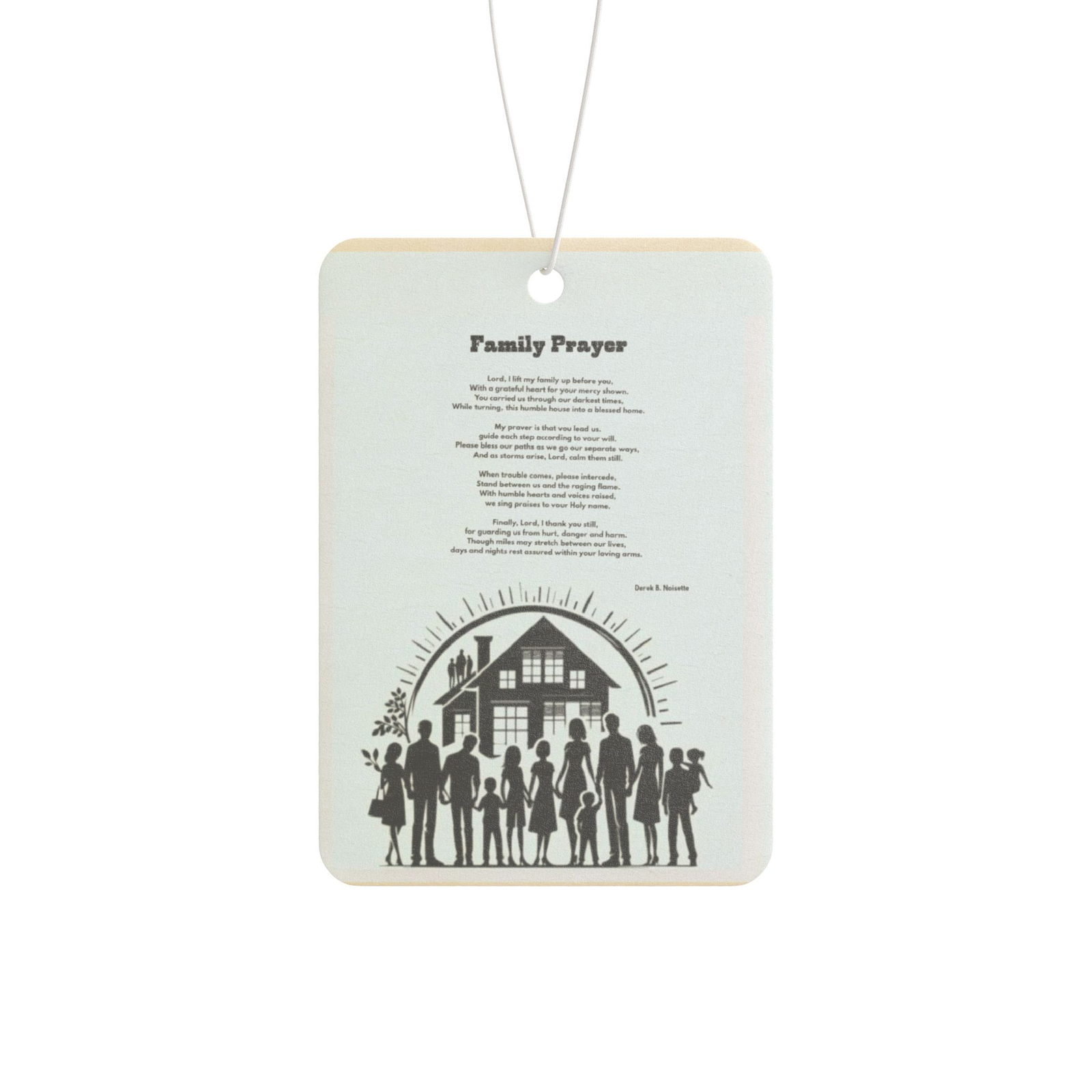 Bring a quiet, grounding moment into every drive with this scented car air freshener. Printed on sturdy 80 pt. paper board, the design features a soft light green backdrop with a silhouetted family and the complete Family Prayer above — a gentle visual reminder of faith, connection, and gratitude. The calming green tone evokes renewal, peace, and spiritual encouragement, creating a comforting presence during every journey.