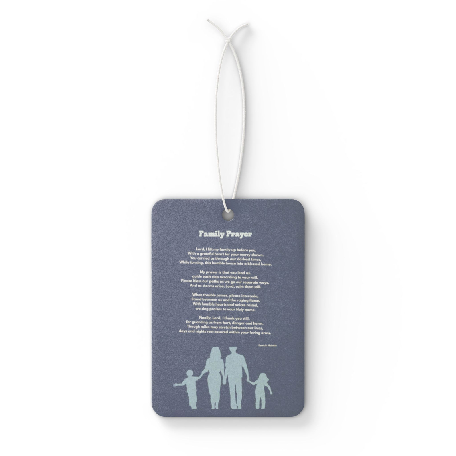 The full poem by Derek B. Noisette from the Spiritual Desires Collection is printed clearly, allowing the words to serve as a daily reminder that God’s love and protection surround the family wherever life leads. Whether driving to work, running errands, or traveling long distances, this air freshener offers both a pleasant fragrance and a moment of spiritual reflection.