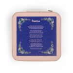 A compact, softly lined jewelry travel case crafted to keep your most delicate pieces protected, and your spirit encouraged, wherever life leads. The square PU leather exterior opens with a secure zip-around closure to reveal four divided compartments, cushioned ring rolls, and three necklace hooks tucked beneath a slim pocket. Earrings, rings, studs, and chains stay separated and tangle-free, while the plush interior gently cushions metals and gemstones against scratches. Its small 4” x 4” x 2” footprint slips effortlessly into a purse, carry-on, or weekend bag, making it perfect for both travel and daily devotion.