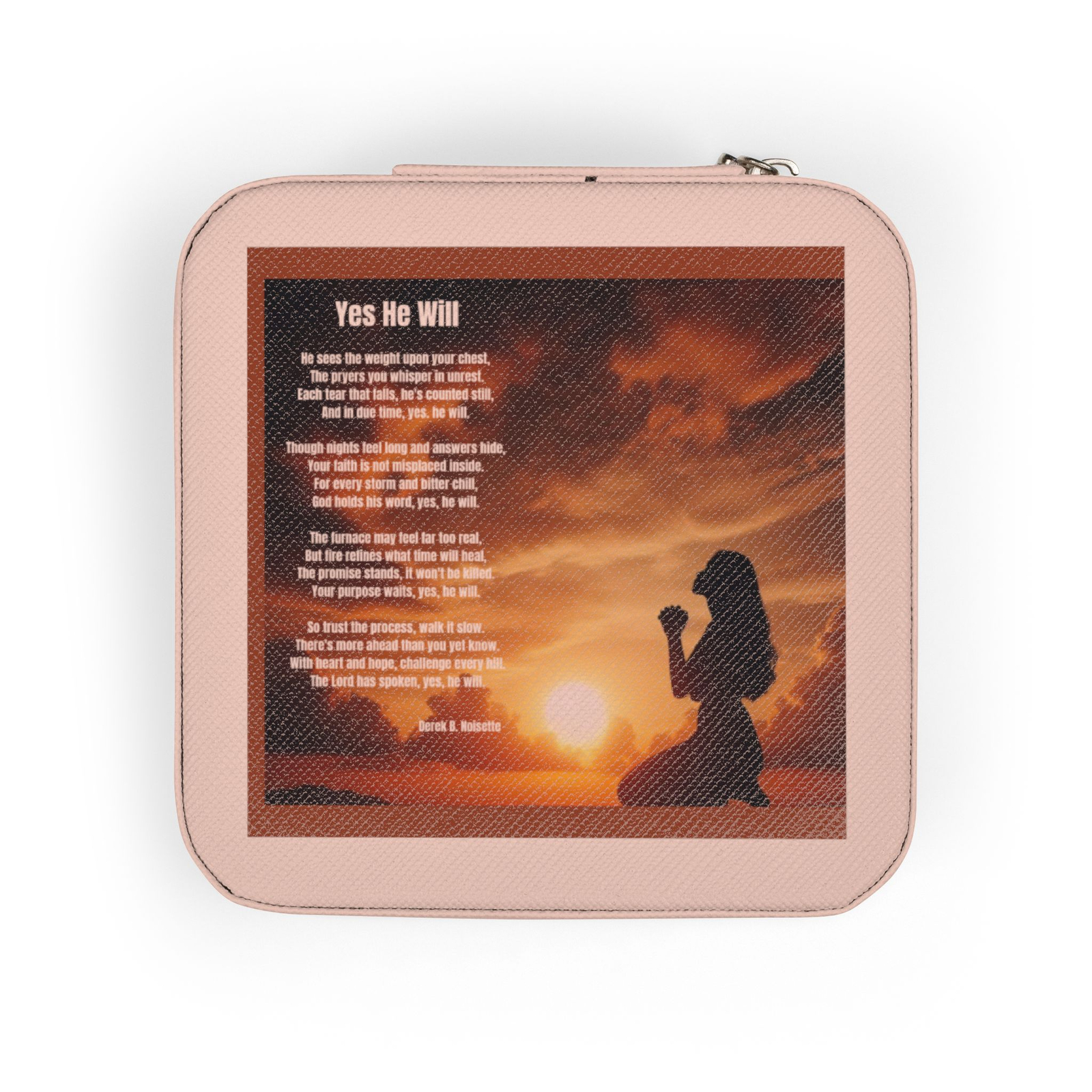 Yes He Will / Compact Jewelry Travel Case — Sunset Silhouette Design, Portable Ring & Earring Organizer