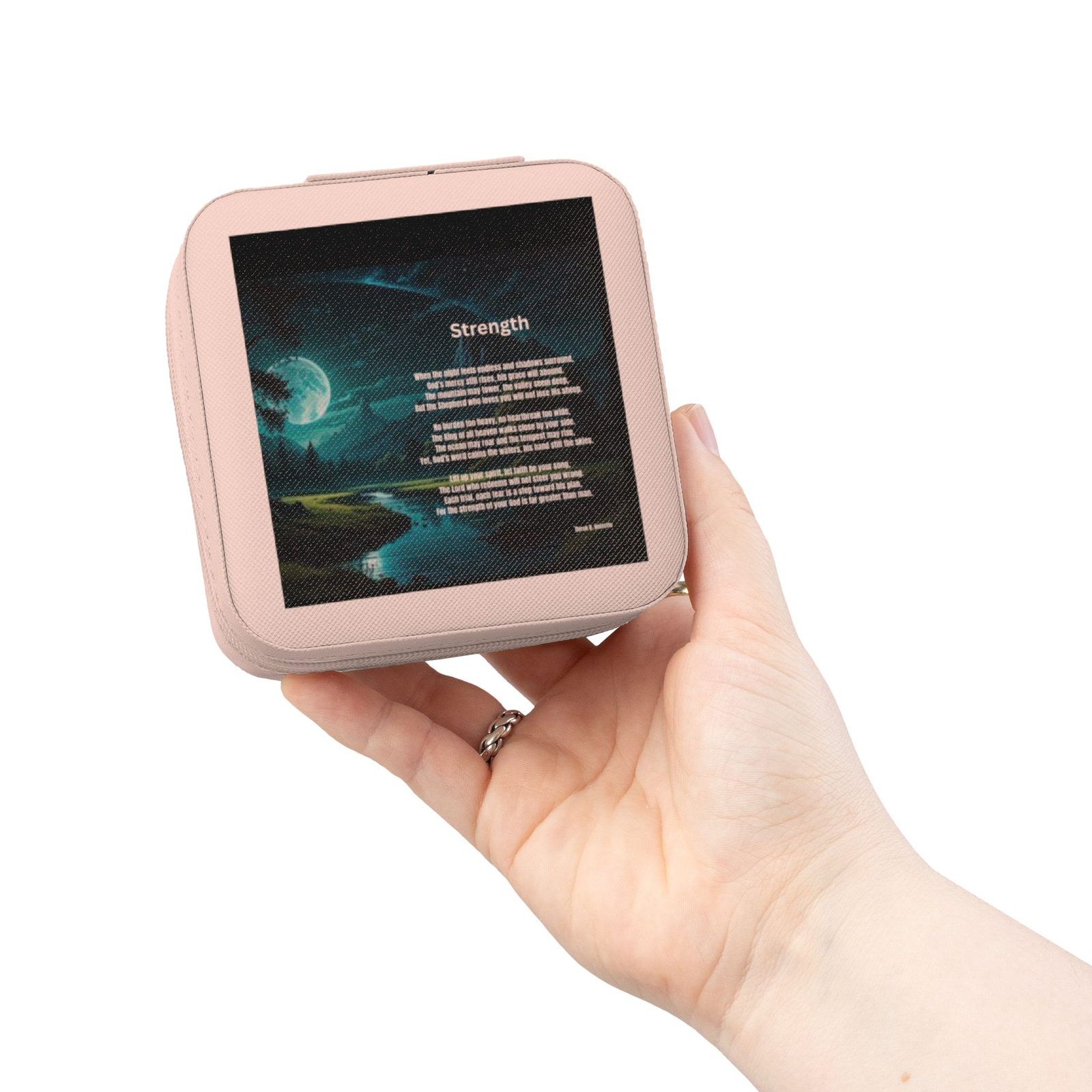 A compact, softly lined jewelry travel case crafted to keep your most delicate pieces protected, and your spirit encouraged, wherever life leads. The square PU leather exterior opens with a secure zip-around closure to reveal four divided compartments, cushioned ring rolls, and three necklace hooks tucked beneath a slim pocket. Earrings, rings, studs, and chains stay separated and tangle-free, while the plush interior gently cushions metals and gemstones against scratches. Its small 4” x 4” x 2” footprint slips effortlessly into a purse, carry-on, or weekend bag, making it perfect for both travel and daily devotion.