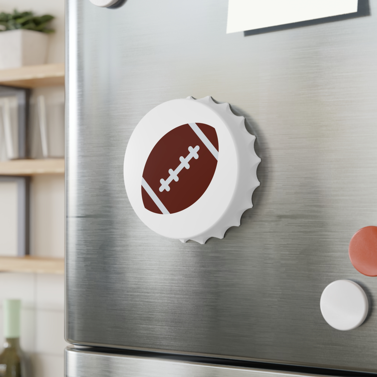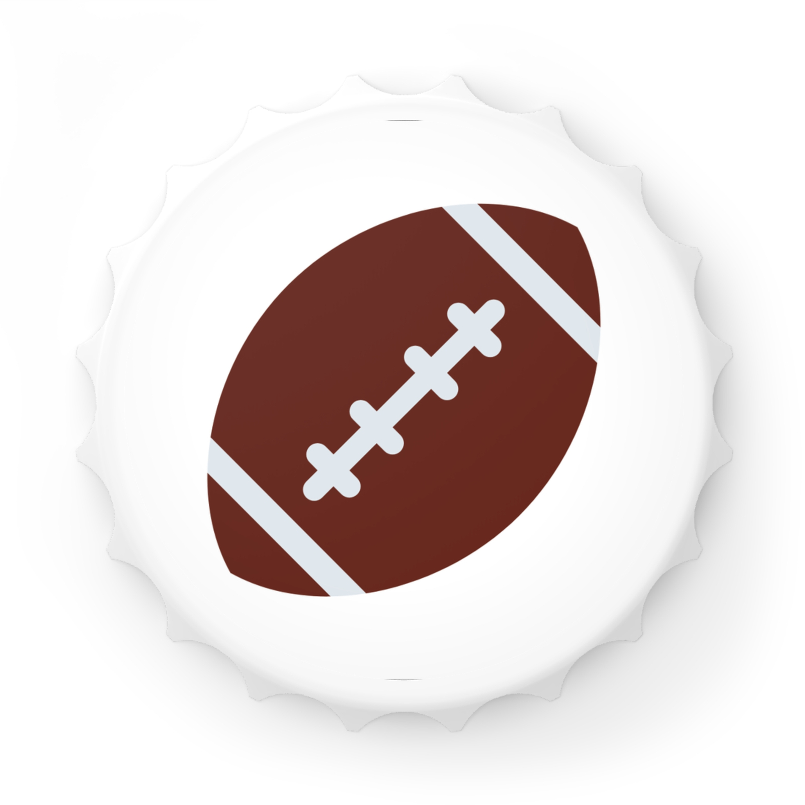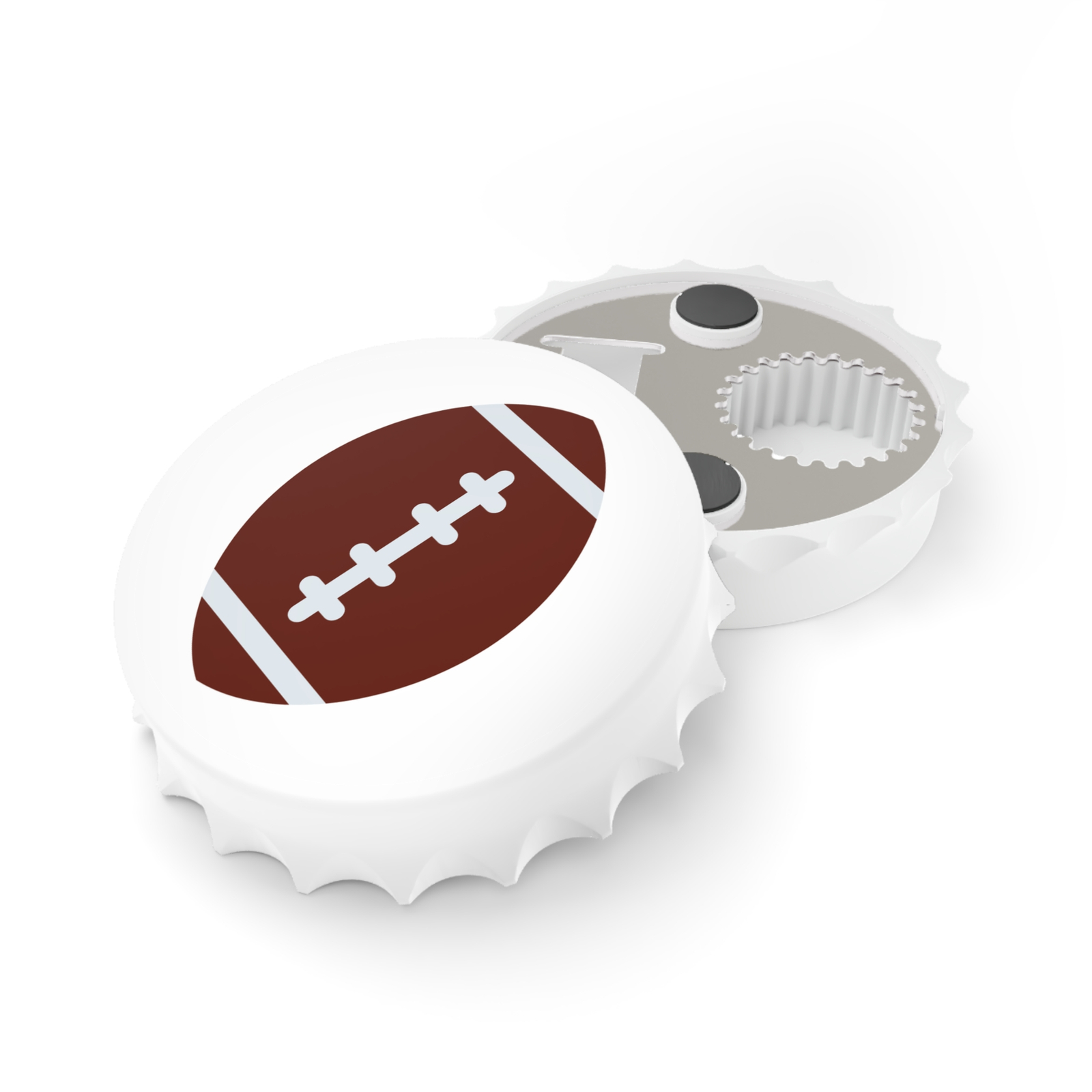 A sturdy, two-sided bottle opener that brings a thoughtful, reflective touch to your gatherings. The top side showcases a vivid Football high-resolution print, while the bottom side houses two metal opening mechanisms and strong magnets so it stays conveniently on fridges or metal bars. Lightweight polycarbonate shell with a metal body gives durable performance and a comfortable grip. The matte finish reduces glare and keeps the artwork looking rich and tactile. Sized at 3” (7.6 cm), it’s compact enough to stash in a drawer or hang near your drink station. Made for adults.