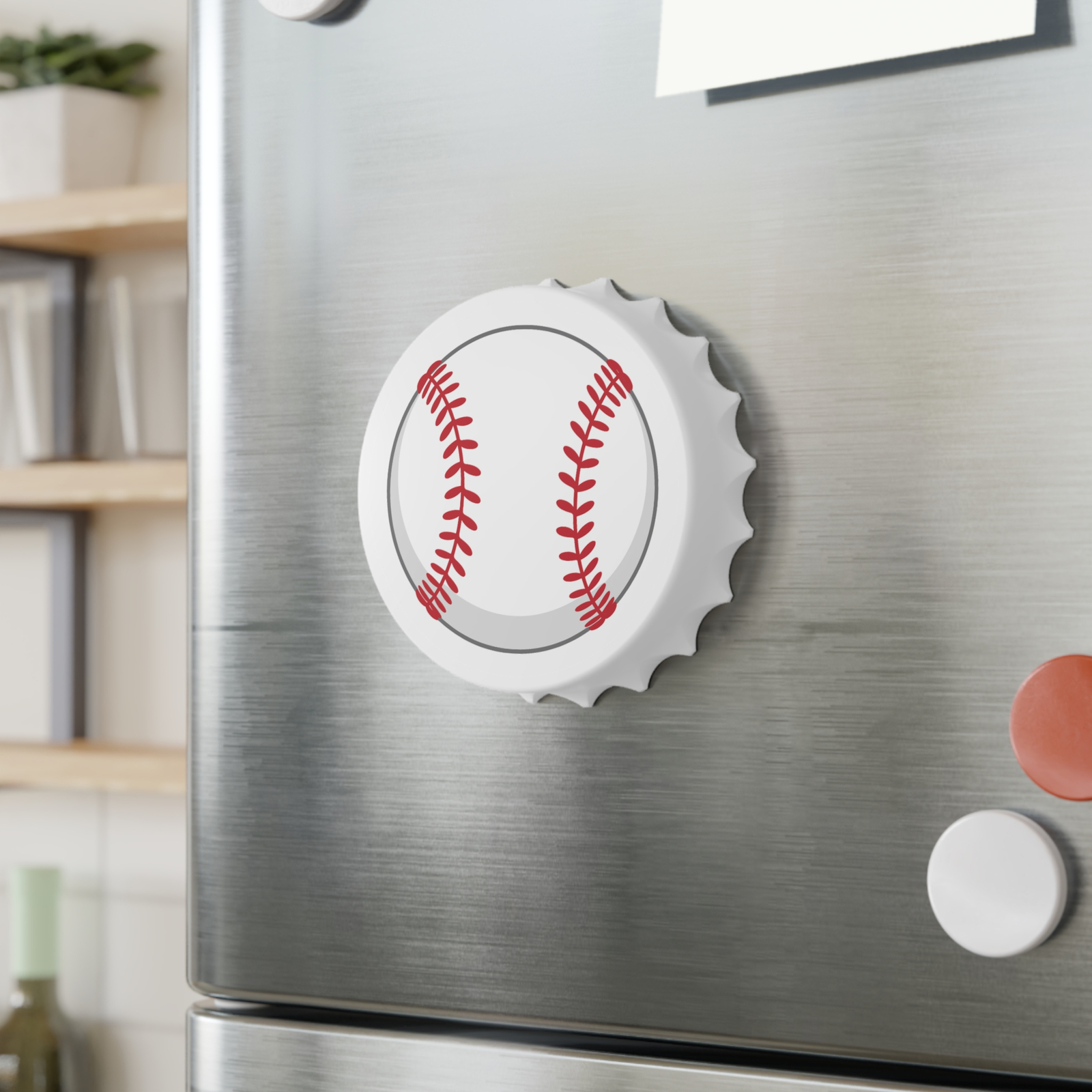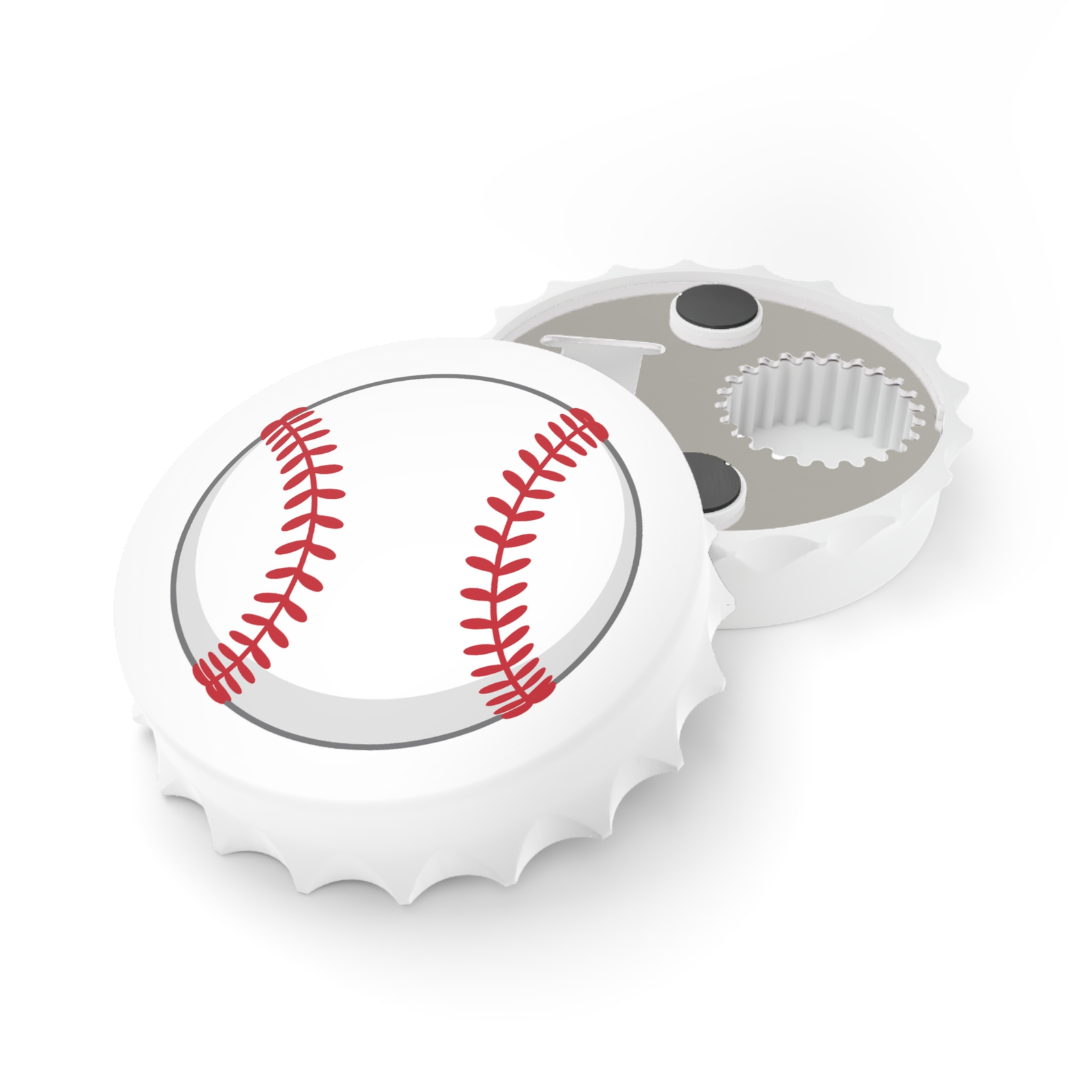 A sturdy, two-sided bottle opener that brings a thoughtful, reflective touch to your gatherings. The top side showcases a vivid Baseball high-resolution print, while the bottom side houses two metal opening mechanisms and strong magnets so it stays conveniently on fridges or metal bars. Lightweight polycarbonate shell with a metal body gives durable performance and a comfortable grip. The matte finish reduces glare and keeps the artwork looking rich and tactile. Sized at 3” (7.6 cm), it’s compact enough to stash in a drawer or hang near your drink station. Made for adults.