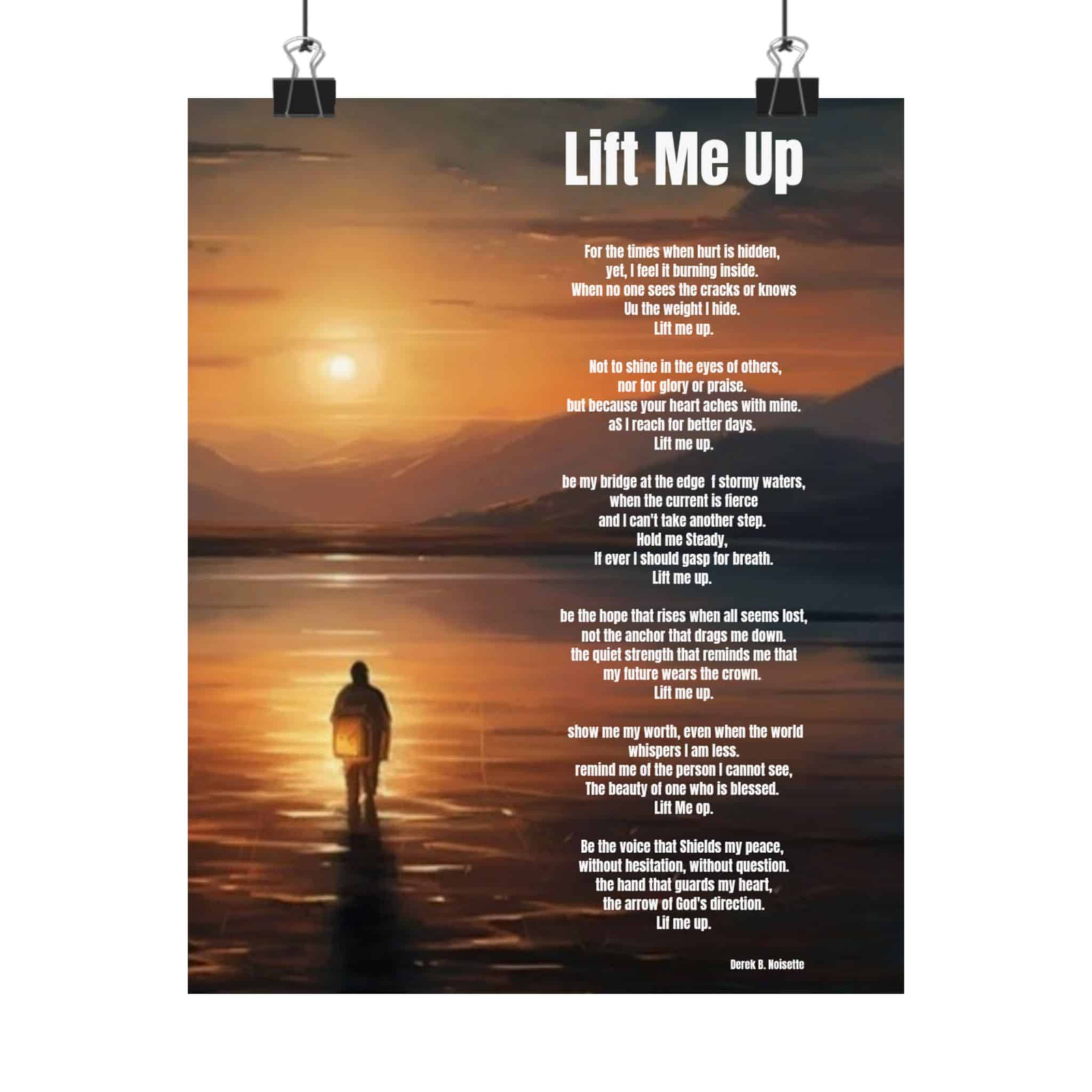 From the Praise Collection, Lift Me Up is a museum-grade matte poster created to inspire hope, surrender, and renewal. This artwork captures a powerful visual moment, a lone man standing on the shore as a breathtaking sunrise breaks across the horizon, with the words of the poem written in the sky above him.