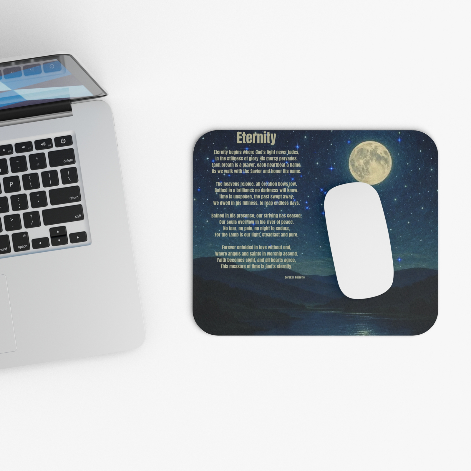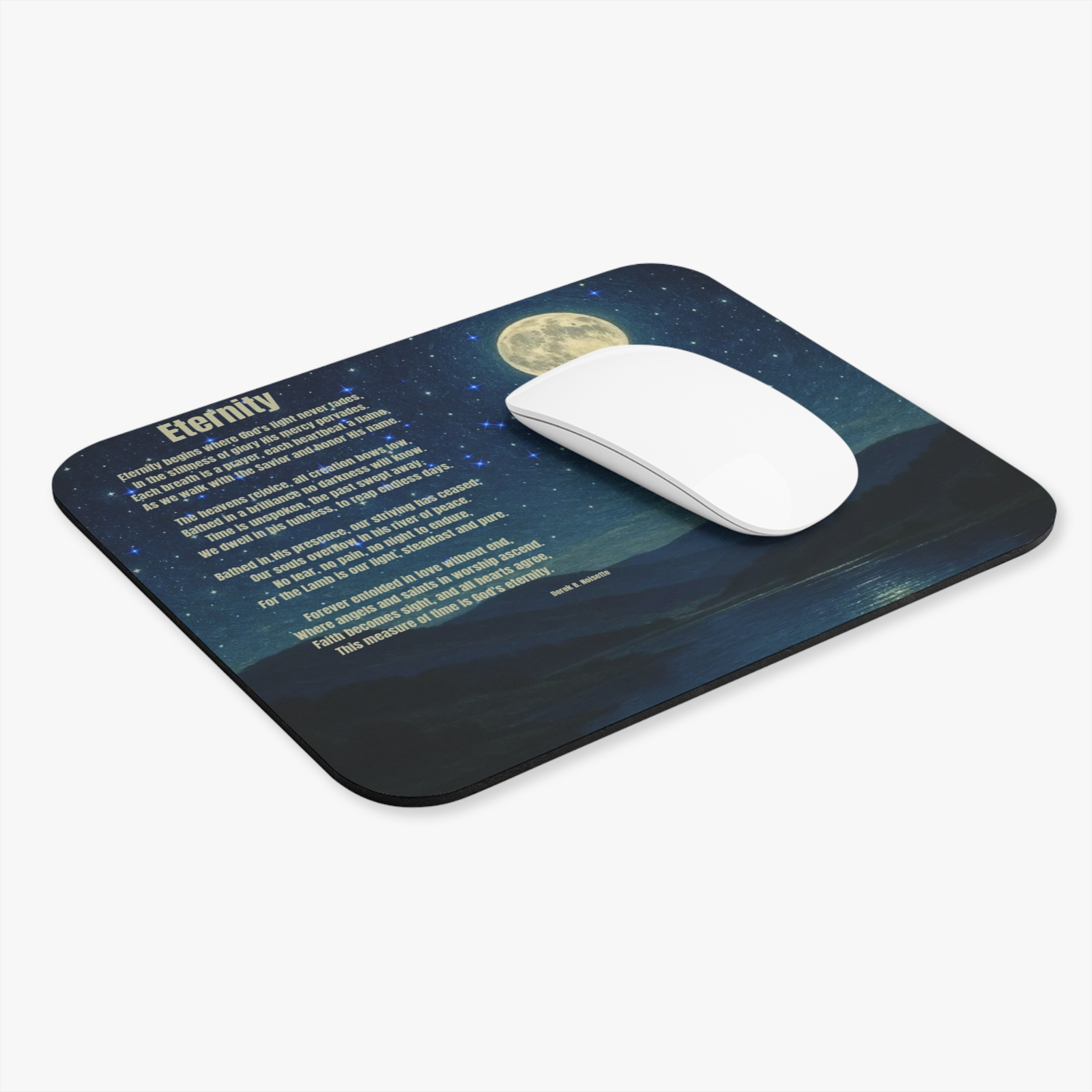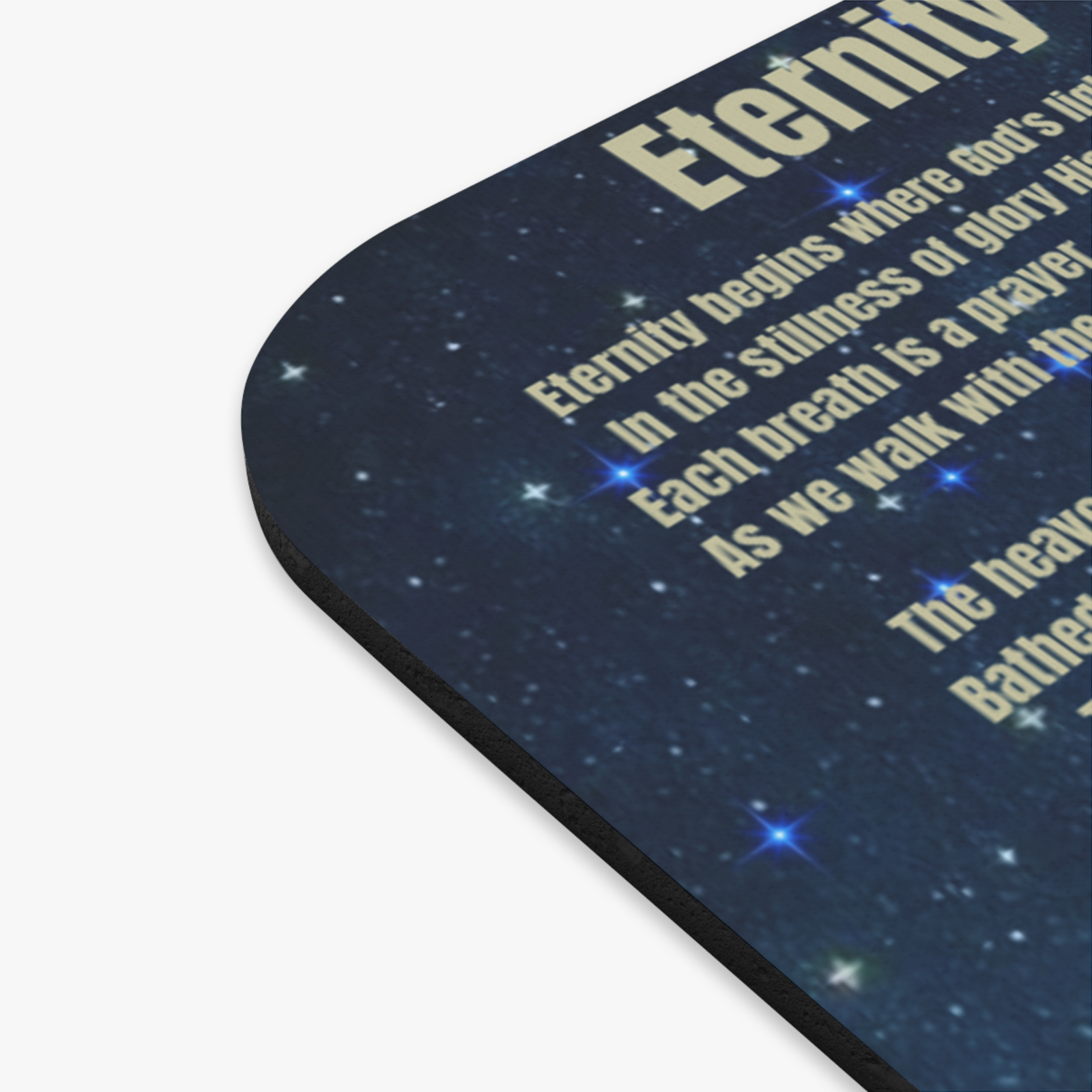 From the Praise Collection comes the Eternity Mouse Pad, a sacred design that captures the beauty of God’s everlasting promise. The artwork features a calm river flowing beneath a starry night sky, a scene of stillness where the heavens declare His glory. Across the sky are written the words of Eternity by Derek B. Noisette, gently reminding you that our true home is not measured in days but in God’s unending presence. This mouse pad transforms any desk into a place of reflection and devotion, anchoring your routine in peace and gratitude. Every glance at its design calls you back to the hope of eternal life, the brilliance of His light, and the assurance that time surrenders to the Savior’s love.