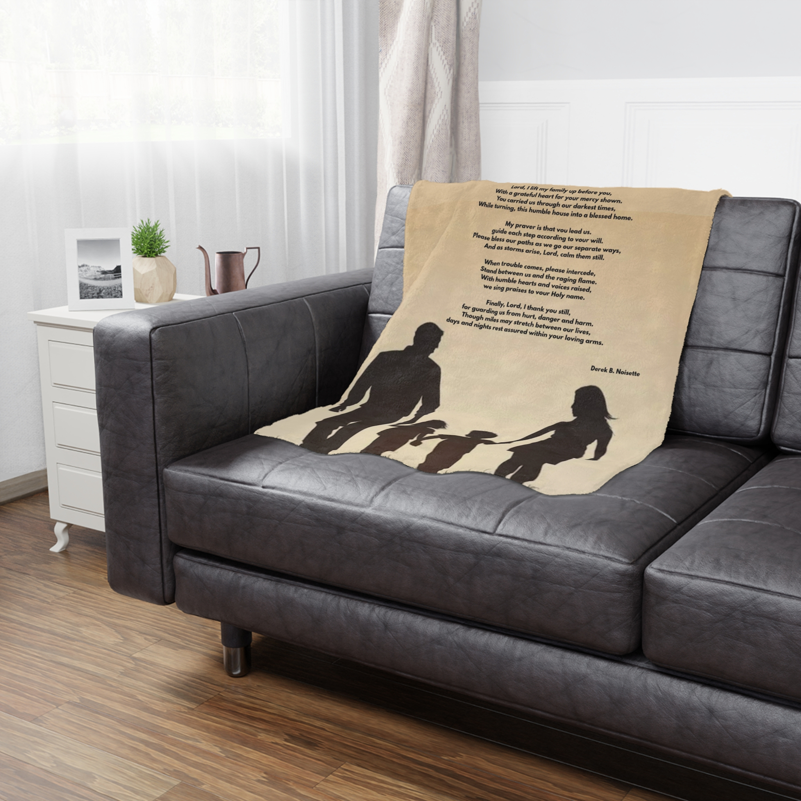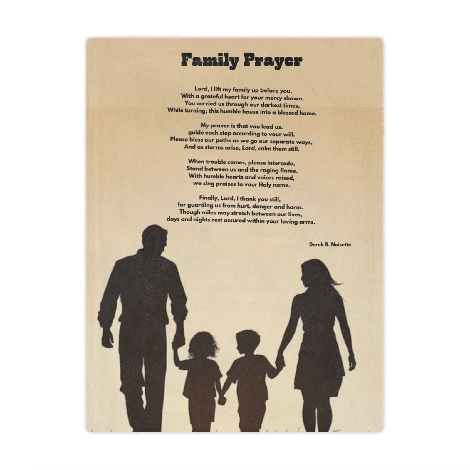 This plush blanket offers more than comfort—it’s a daily walk with faith, warmth, and reflection. Featuring artwork of a loving family holding hands against a warm tan backdrop and the heartfelt poem “Family Prayer” by Derek B. Noisette, this piece was created to comfort the body and inspire the soul.