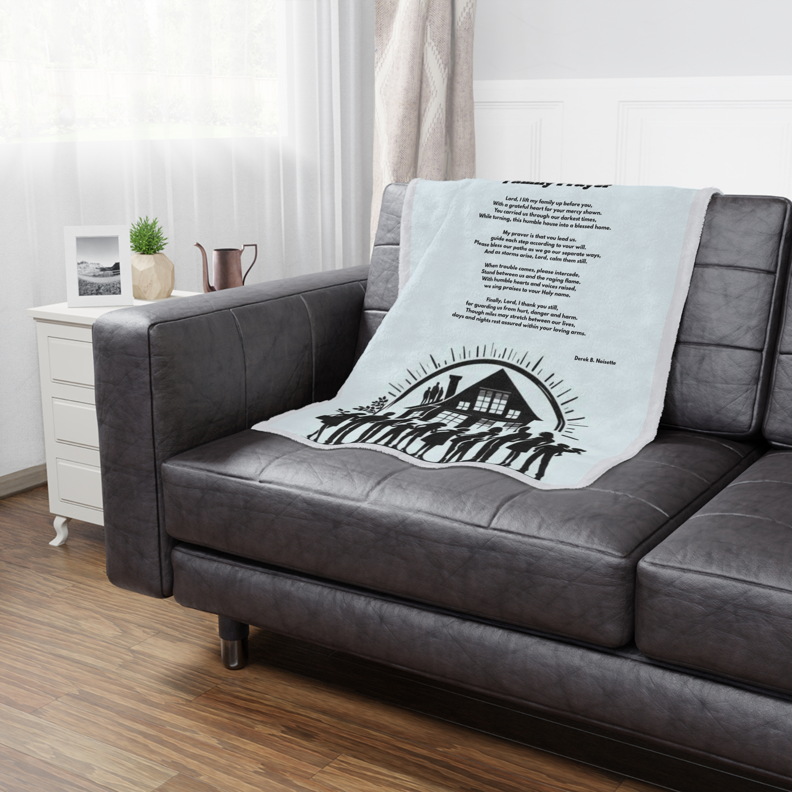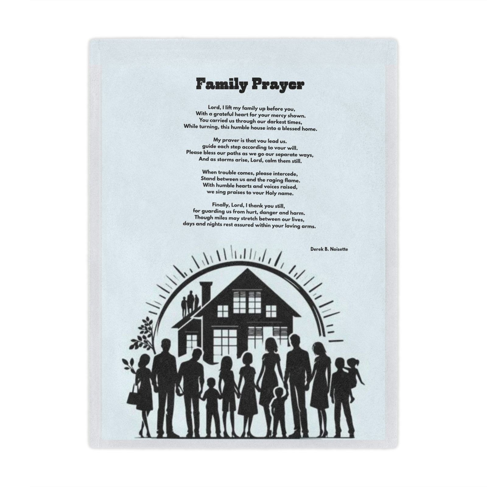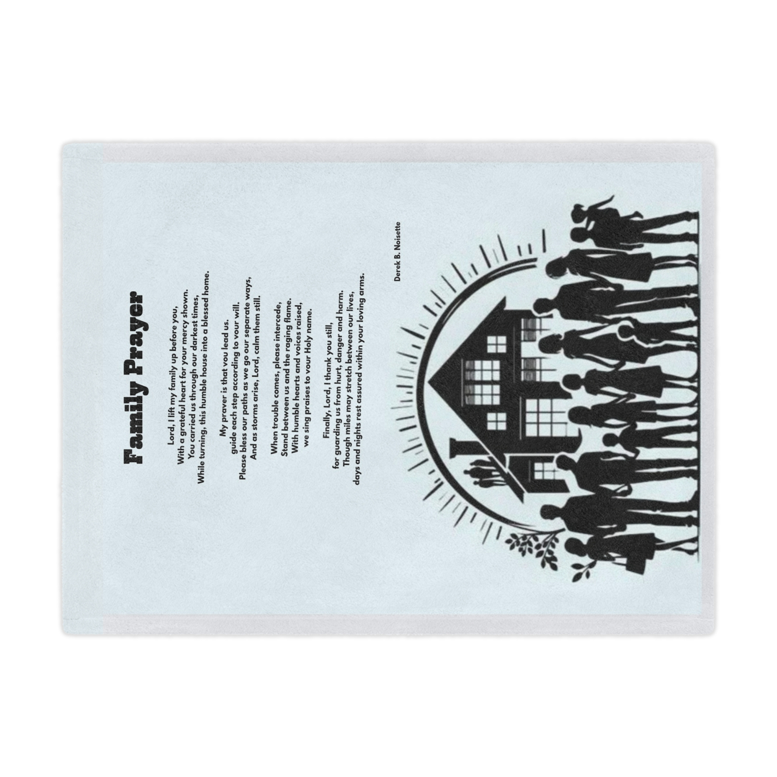 This plush blanket offers more than comfort—it’s a daily walk with faith, warmth, and reflection. Featuring artwork of a loving family holding hands against a soothing light green backdrop and the heartfelt poem “Family Prayer” by Derek B. Noisette, this piece was created to comfort the body and inspire the soul.