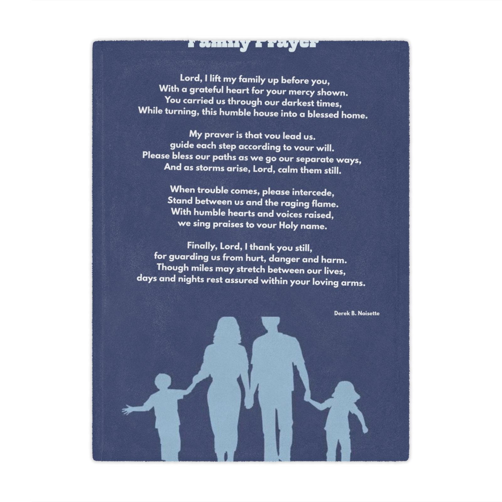 This plush blanket offers more than comfort, it’s a daily walk with faith, warmth, and reflection. Featuring artwork of a loving family holding hands against a rich purple backdrop and the heartfelt poem “Family Prayer” by Derek B. Noisette, this piece was created to comfort the body and inspire the soul.