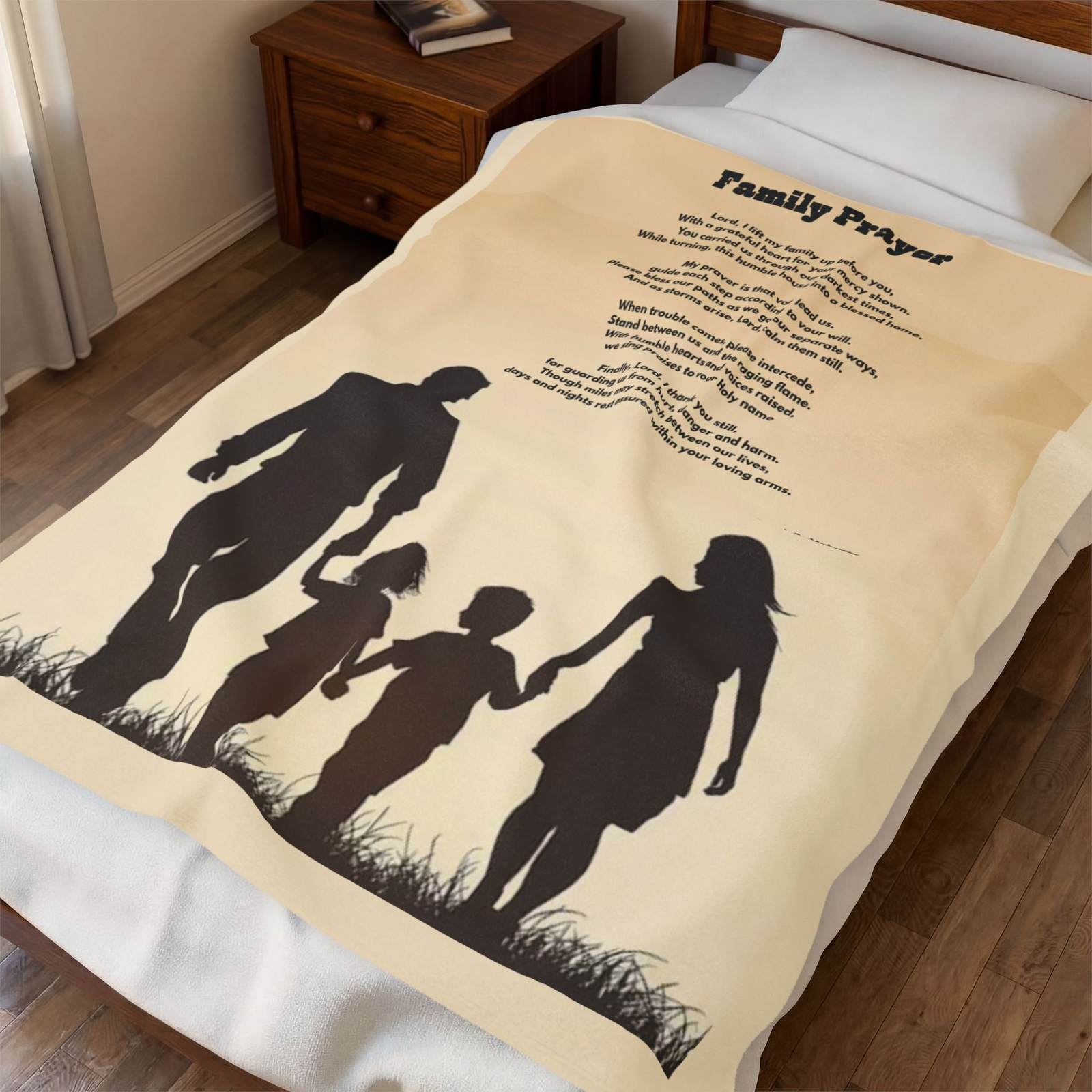 Crafted with ultra-soft velveteen polyester and printed in vivid, high-resolution detail, this inspirational blanket features the powerful poem “Family Prayer.” The soothing tan color evokes warmth, stability, and spiritual calm, creating a comforting presence wherever it is placed. Whether used during quiet prayer time, family devotion, reflection, or restful evenings, this blanket offers both physical warmth and a spiritual covering rooted in God’s mercy and protection.