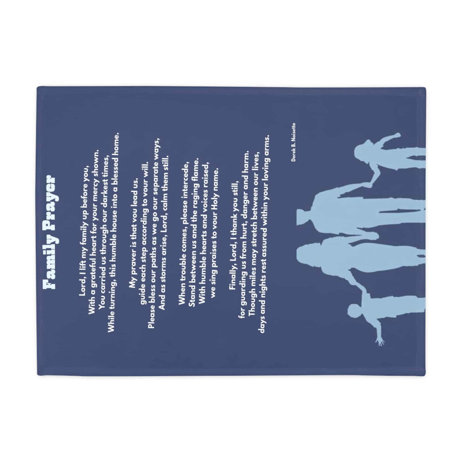 A soft, plush fleece blanket that wraps a household in a quiet moment of comfort and faith. Deep navy tones set a calm backdrop for a heartfelt family prayer printed across the center, while gentle silhouettes of parents and children anchor the design. The fabric feels lightweight yet cozy, easy to drape over knees during evening devotion or to tuck around little ones at bedtime. It settles into family life: on the couch during a storm, folded by the armchair for reflection, or laid across a guest bed to share a whispered blessing. The result is a warm, familiar presence that carries both color and meaning without being heavy or fussy.