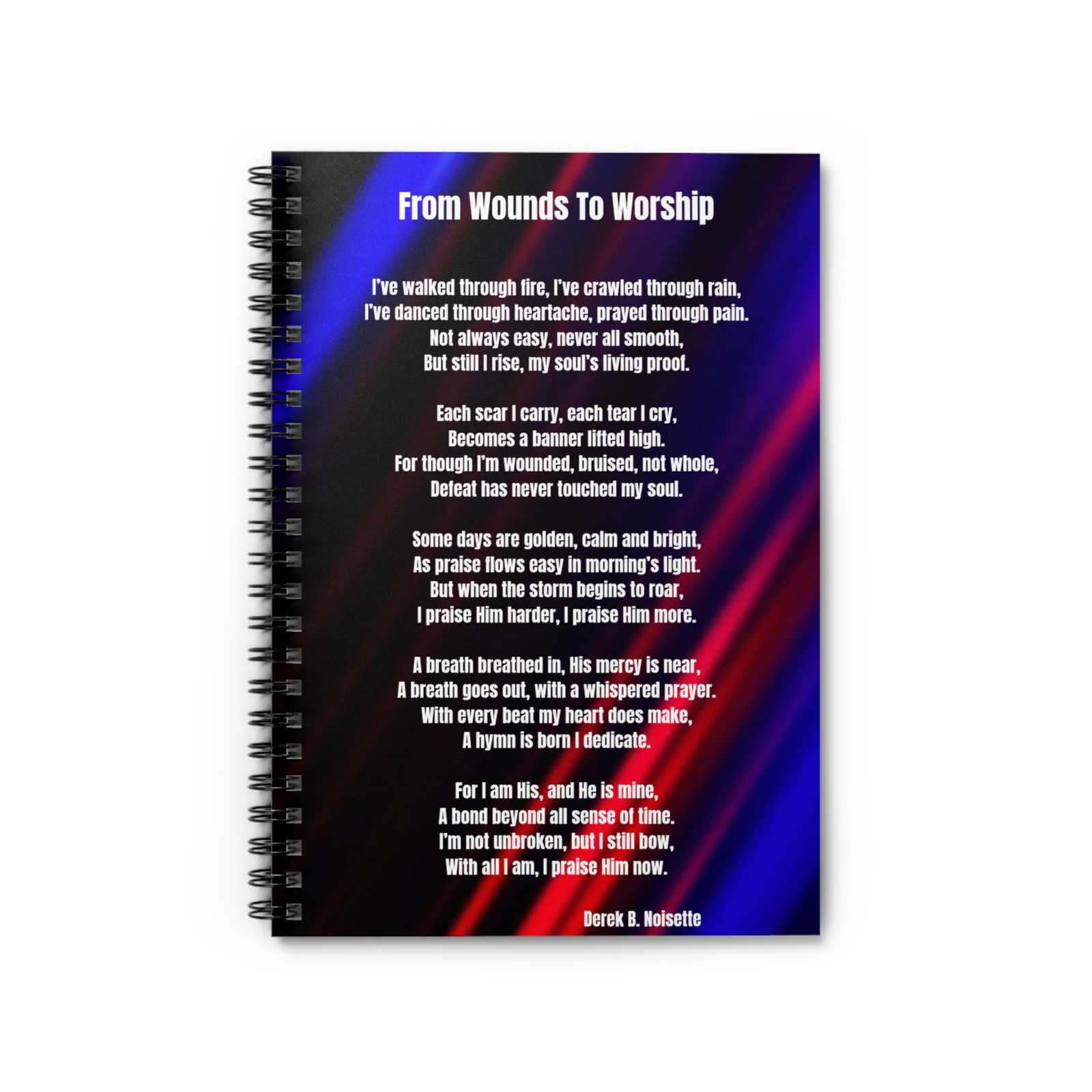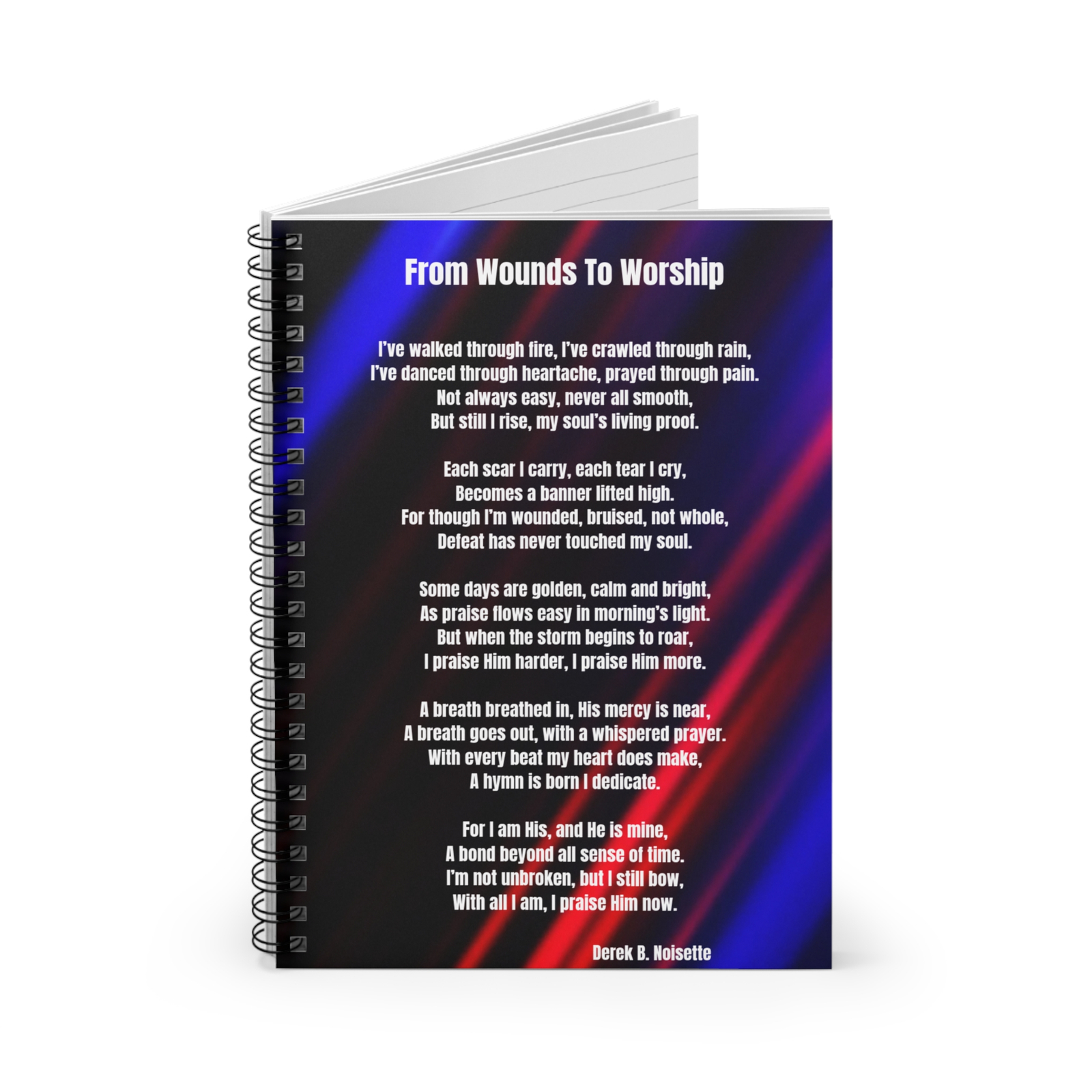This spiral notebook is more than just a place for your thoughts, it’s a sacred space where faith and creativity meet. Featuring a gentle, uplifting design on the cover from the Praise Collection, it beautifully frames the original poem “From Wounds to Worship” by Derek B. Noisette. The imagery and words together invite you to pour your own prayers, reflections, and victories onto the page, trusting that your story is being guided by the hand of the Creator.