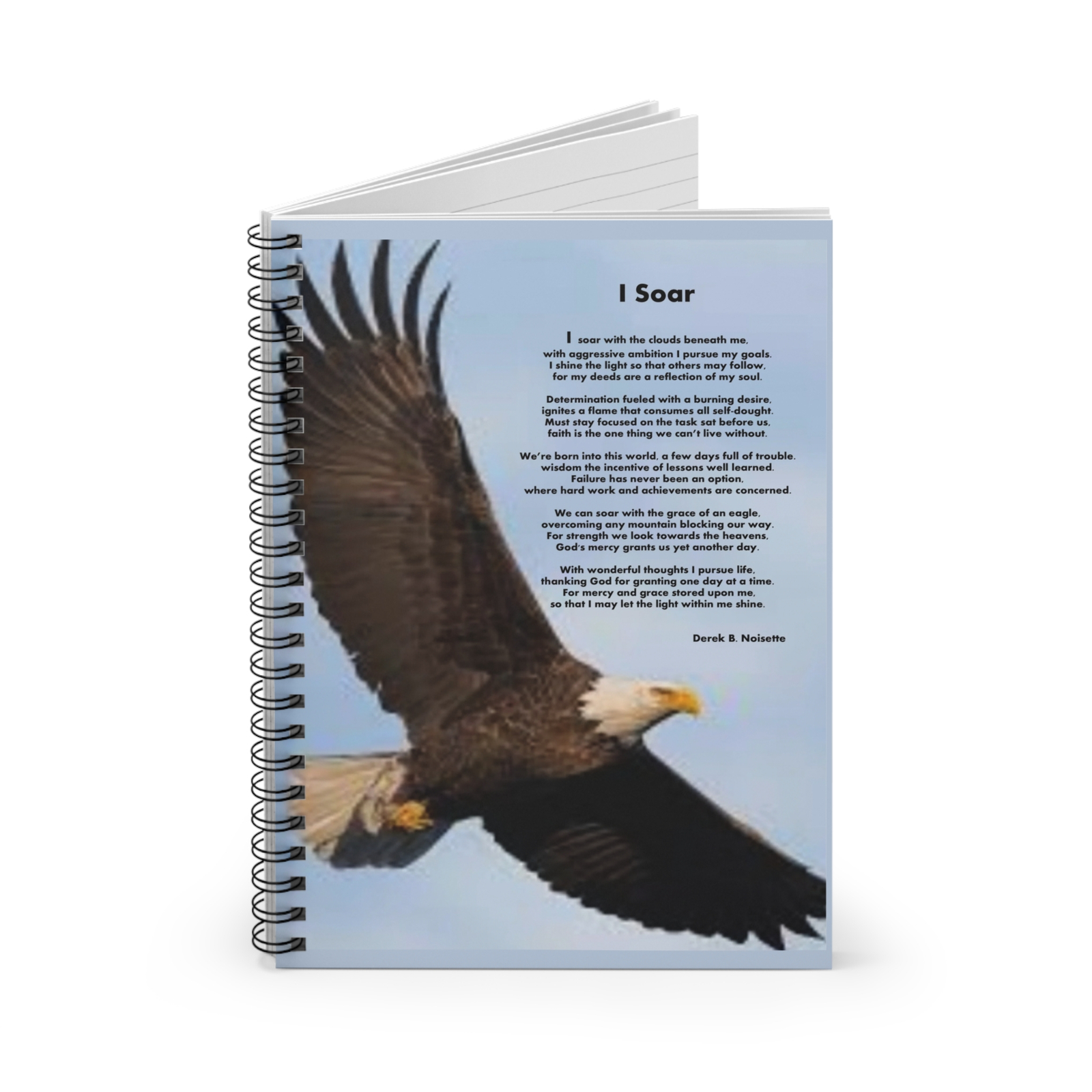 Elevate your writing journey with the “I Soar” Spiral Notebook, a soul-stirring blend of purpose, inspiration, and design. Featuring the powerful and poetic words of “I Soar” by Derek B. Noisette printed boldly on the cover, this notebook is more than a space to write, it is a daily reminder that your dreams, your faith, and your voice have wings.