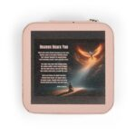 A compact, softly lined jewelry travel case crafted to keep your most delicate pieces protected, and your spirit encouraged, wherever life leads. The square PU leather exterior opens with a secure zip-around closure to reveal four divided compartments, cushioned ring rolls, and three necklace hooks tucked beneath a slim pocket. Earrings, rings, studs, and chains stay separated and tangle-free, while the plush interior gently cushions metals and gemstones against scratches. Its small 4” x 4” x 2” footprint slips effortlessly into a purse, carry-on, or weekend bag, making it perfect for both travel and daily devotion.