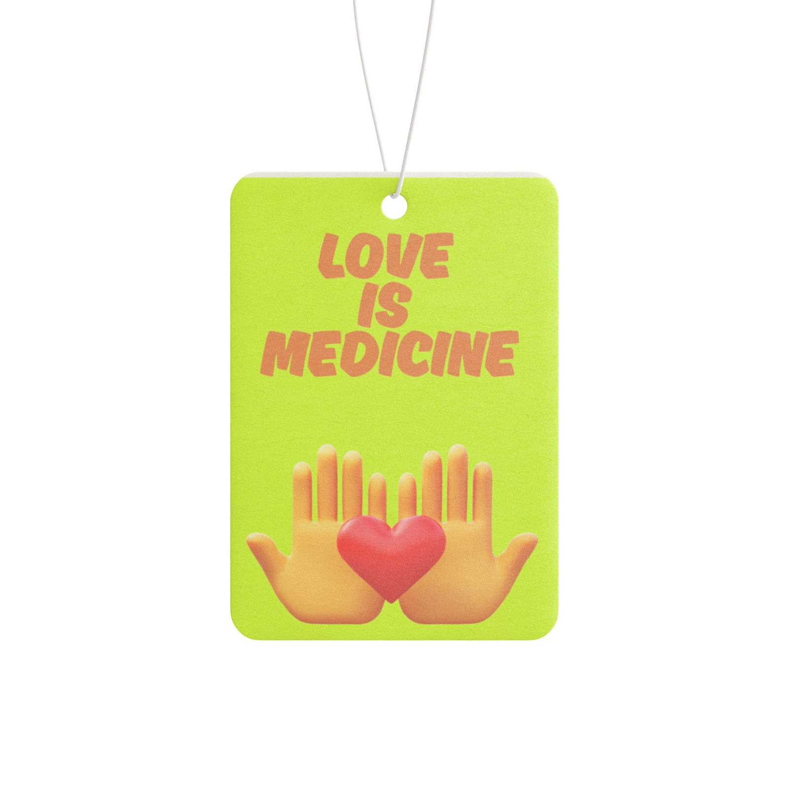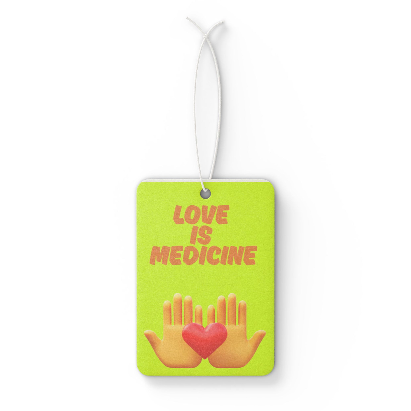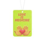 Breathe in peace and purpose with the Love Is Medicine Inspirational Car Air Freshener. This touching design showcases two open hands tenderly holding a red heart, with the uplifting words Love Is Medicine above—reminding us that the most powerful healing comes from compassion and care.