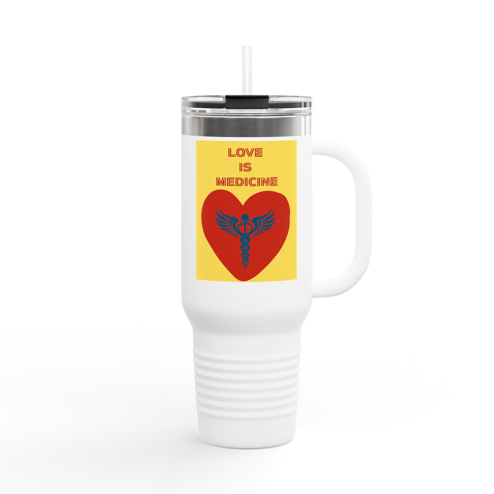 This 40oz insulated travel mug brings warmth, color, and practicality to long days on the move. Part of the Love Is Medicine Collection, the bold pop-art style panel features a bright red heart with a caduceus symbol at its center, representing the connection between love, healing, and the medical profession. The striking imagery blends compassion and care, symbolizing how healing often begins with a heart devoted to helping others. Set against a durable powder-coated finish, the artwork adds a vibrant and meaningful touch. Double-wall stainless steel keeps drinks hot or cold for hours while the ergonomic handle and included straw make sipping comfortable whether you’re driving, hiking, or working at your desk. A secure push-on, leak-proof lid with an easy latch gives confidence on bumpy roads, and the large capacity means fewer refills during long commutes or outdoor adventures. BPA-free materials and a rust-resistant body make it a reliable companion for everyday routines and longer trips.
