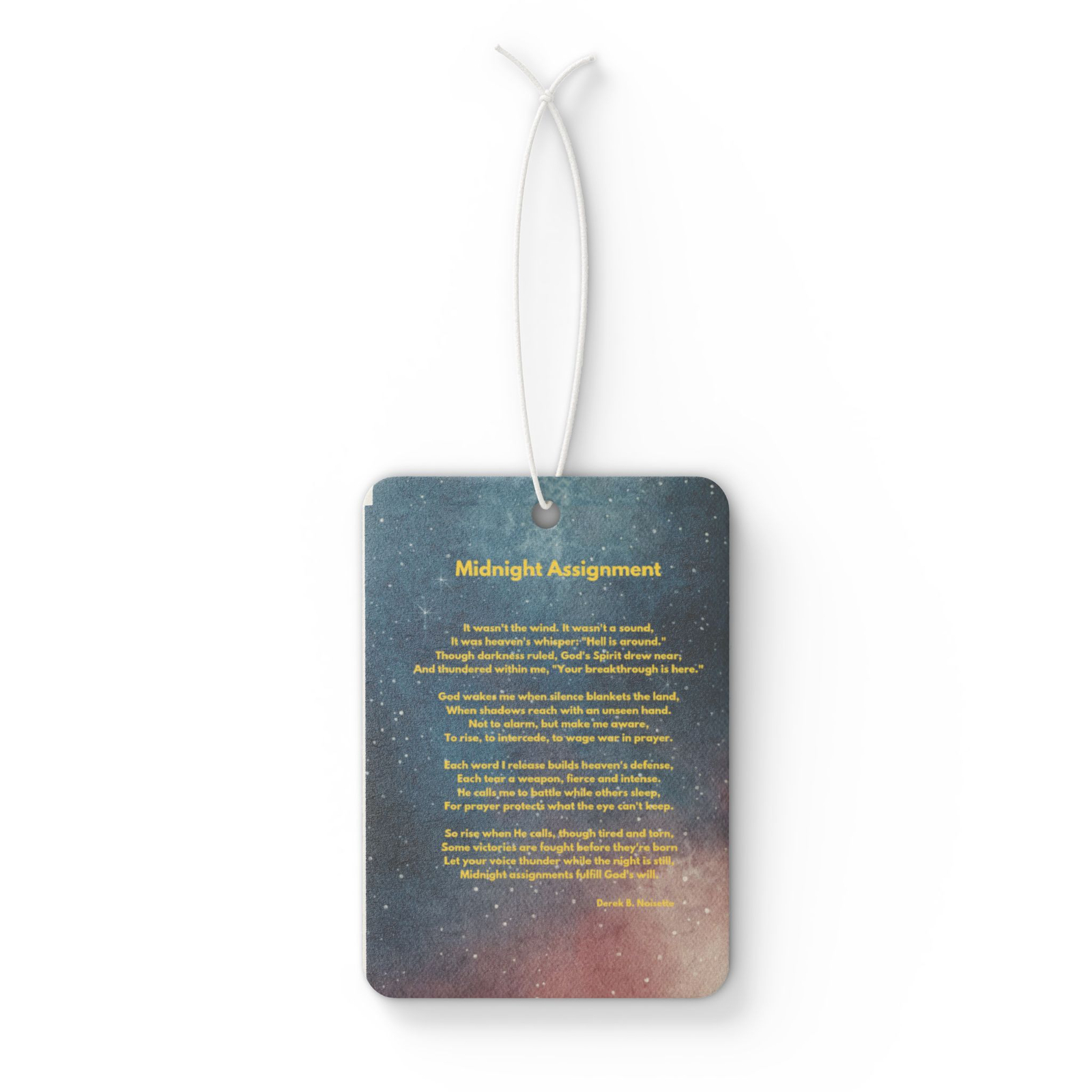 Life moves fast, but faith reminds us to slow down and listen. The Midnight Assignment air freshener from the Praise Collection features the full poem “Midnight Assignment” by Derek B. Noisette, printed beneath a tranquil night sky filled with stars. It’s a gentle, daily reminder that God draws near in the quiet moments.