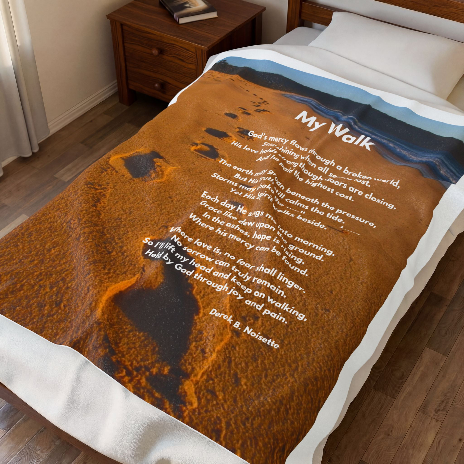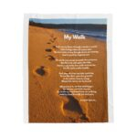 At the heart of this inspirational blanket is the original poem “My Walk”, a poetic expression of faith, mercy, and resilience: