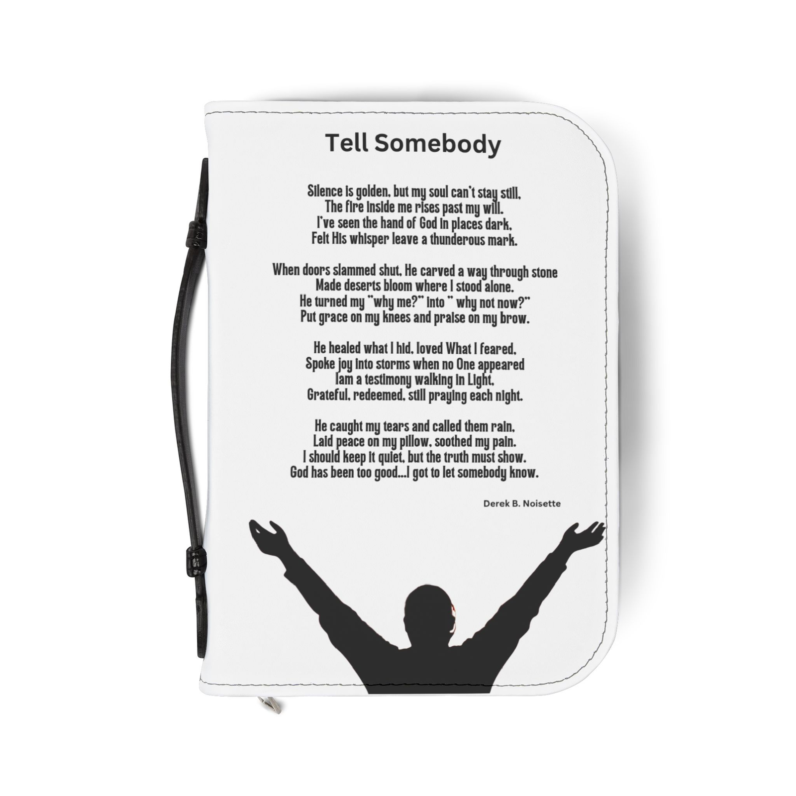 The artwork features a man alone in full surrender, arms lifted high, silhouette bold against a pure white background. There is no noise, no distraction. Just him and God. Above him, quietly rising like a shout from the soul, is Tell Somebody by Derek B. Noisette, a powerful poem of personal praise, bold confession, and the undeniable hand of God.