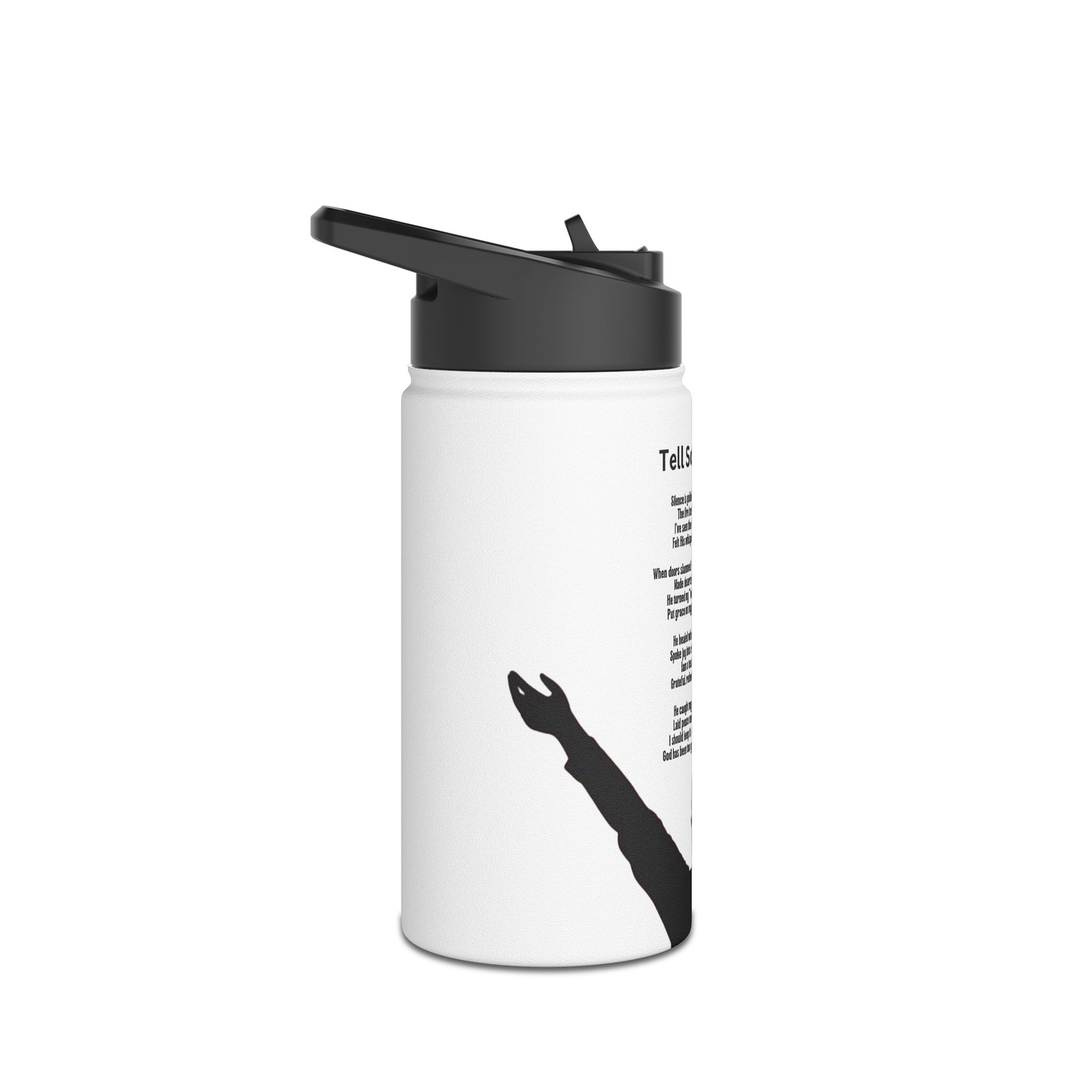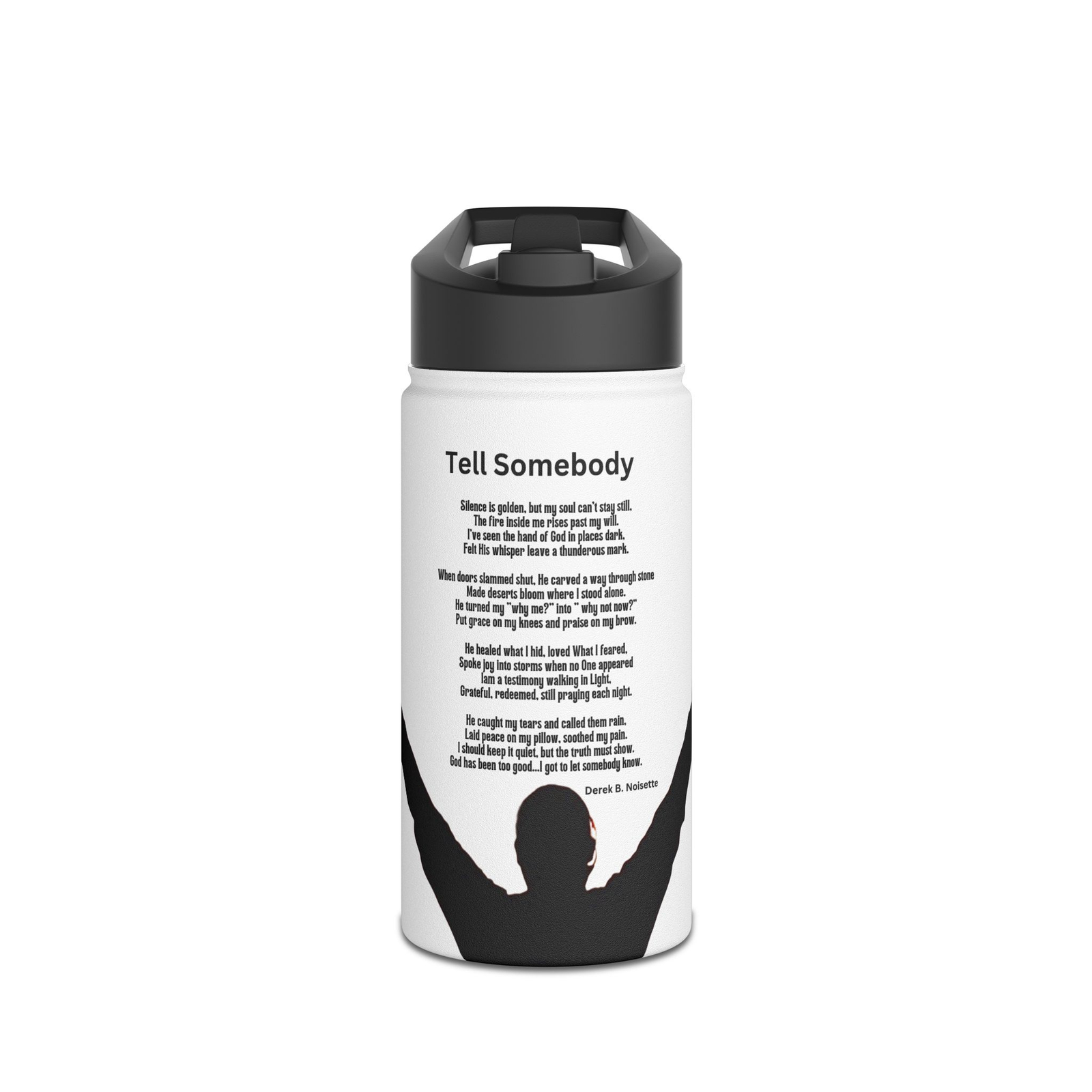 From the Praise 10 Collection comes a stainless steel water bottle designed to do more than keep you refreshed, it helps carry your praise. Wrapped in striking artwork, this bottle features the image of a man alone, arms lifted high in surrender and worship. Against a white, endless background, there is nothing but him and God. Above his silhouette, written in quiet reverence, are the full words of Tell Somebody by Derek B. Noisette, a powerful poem of testimony, healing, and bold gratitude.