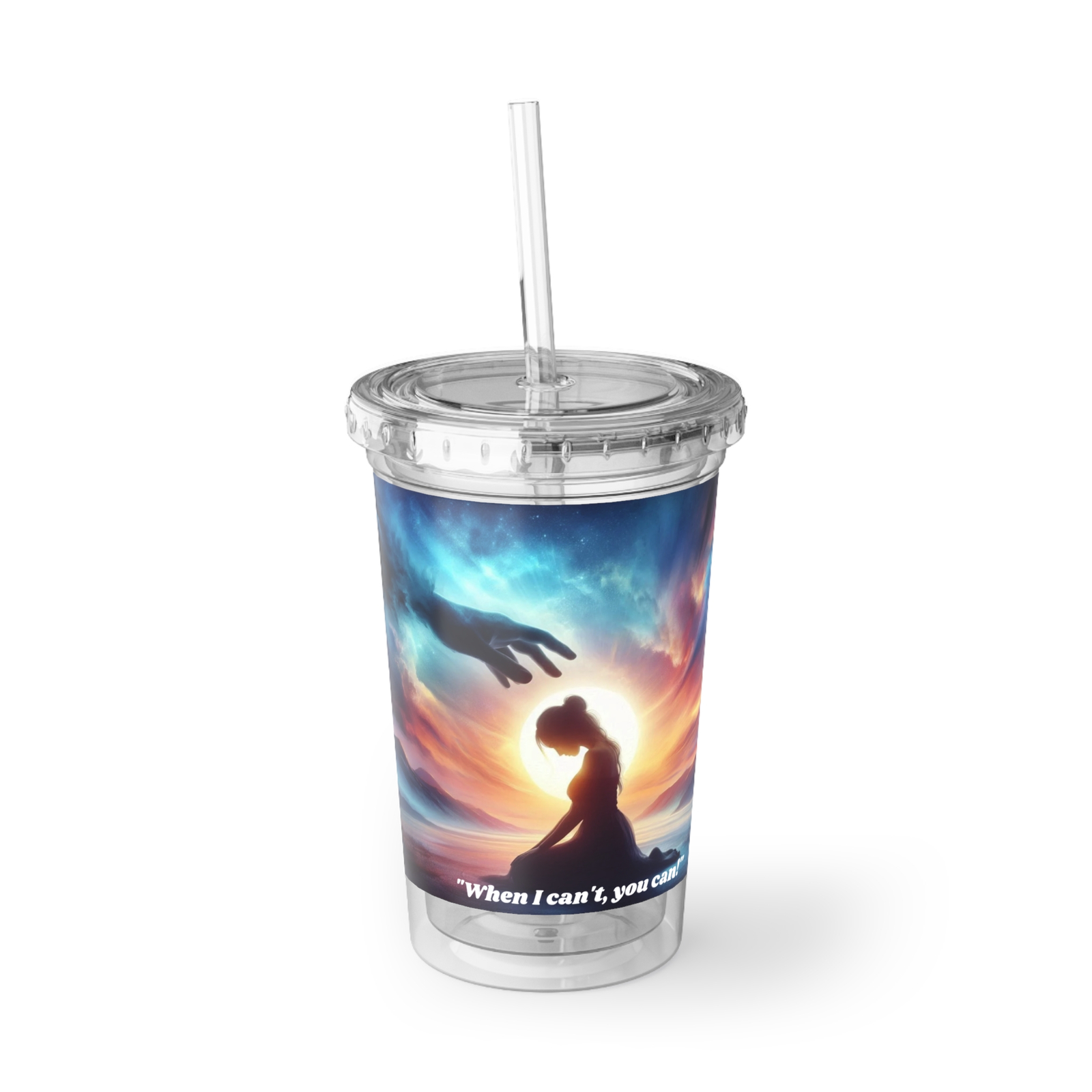 From the Praise 2 Collection comes a powerful acrylic tumbler that speaks volumes without saying a word. The design features a woman in a humble kneeling posture, head bowed in prayer, as a mighty hand reaches down from the clouds above. It’s a moving image of surrender met by strength, accompanied by the words: “When I can’t, You can.”
