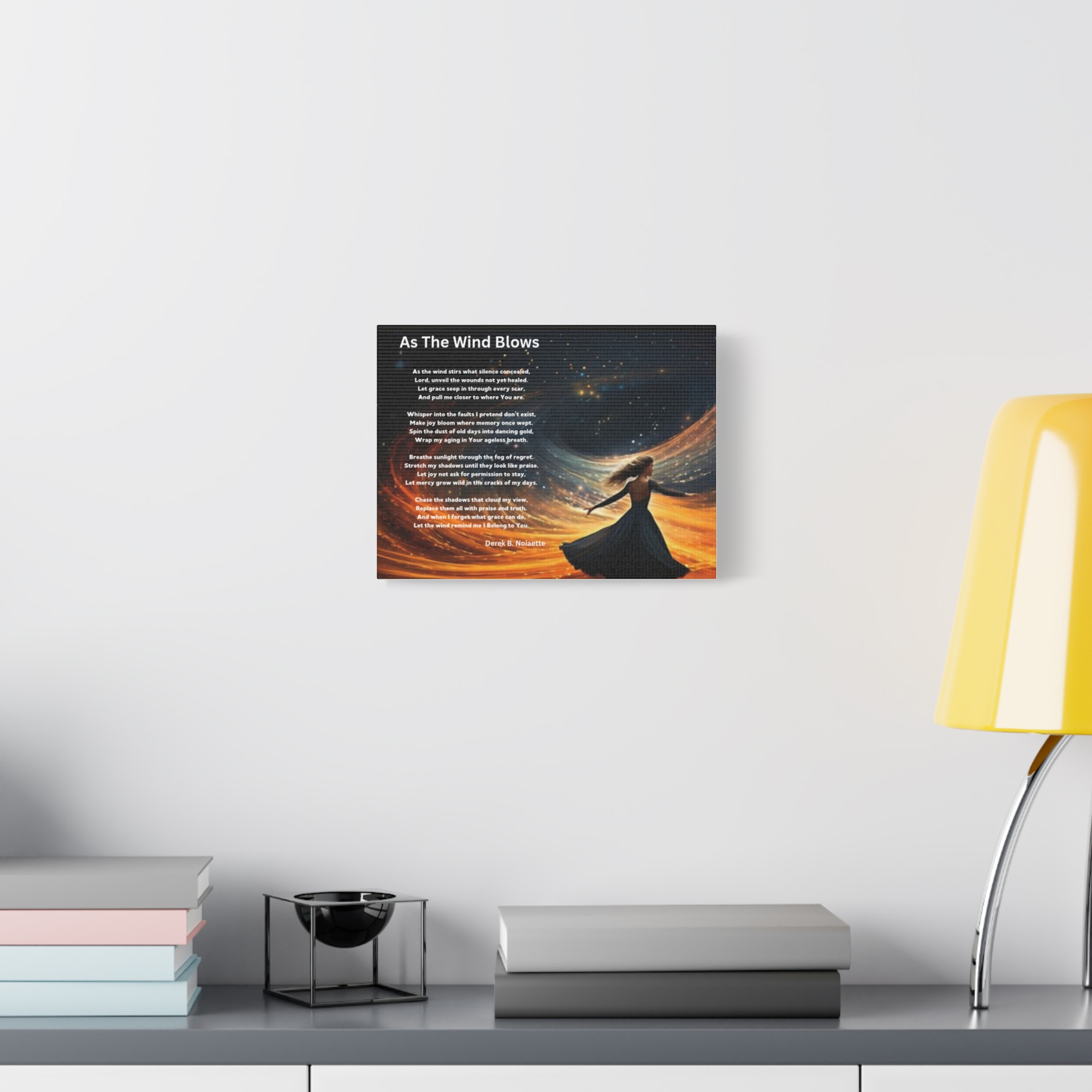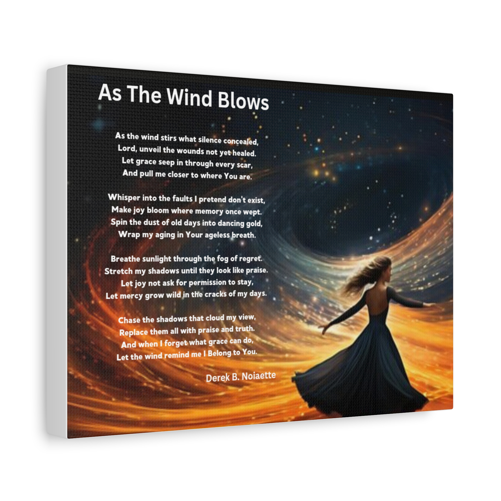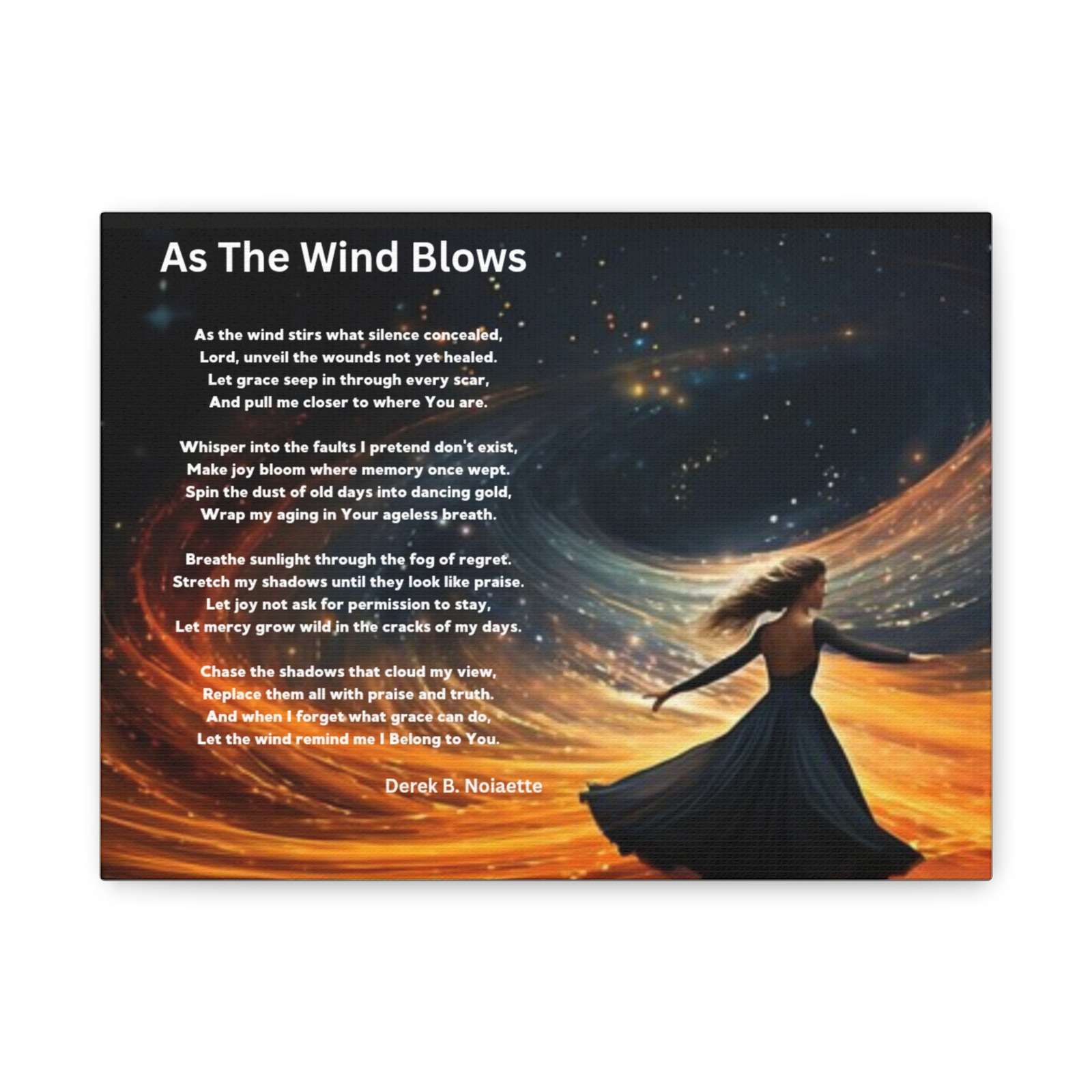 From the Praise 4 Collection comes a radiant canvas print that captures a moment of uninhibited joy and spiritual surrender. The featured artwork shows a woman with arms lifted and waving freely in the wind, her posture open, unburdened, and full of praise. just the wind, the stars, and the spirit of freedom that flows when we let go and trust.