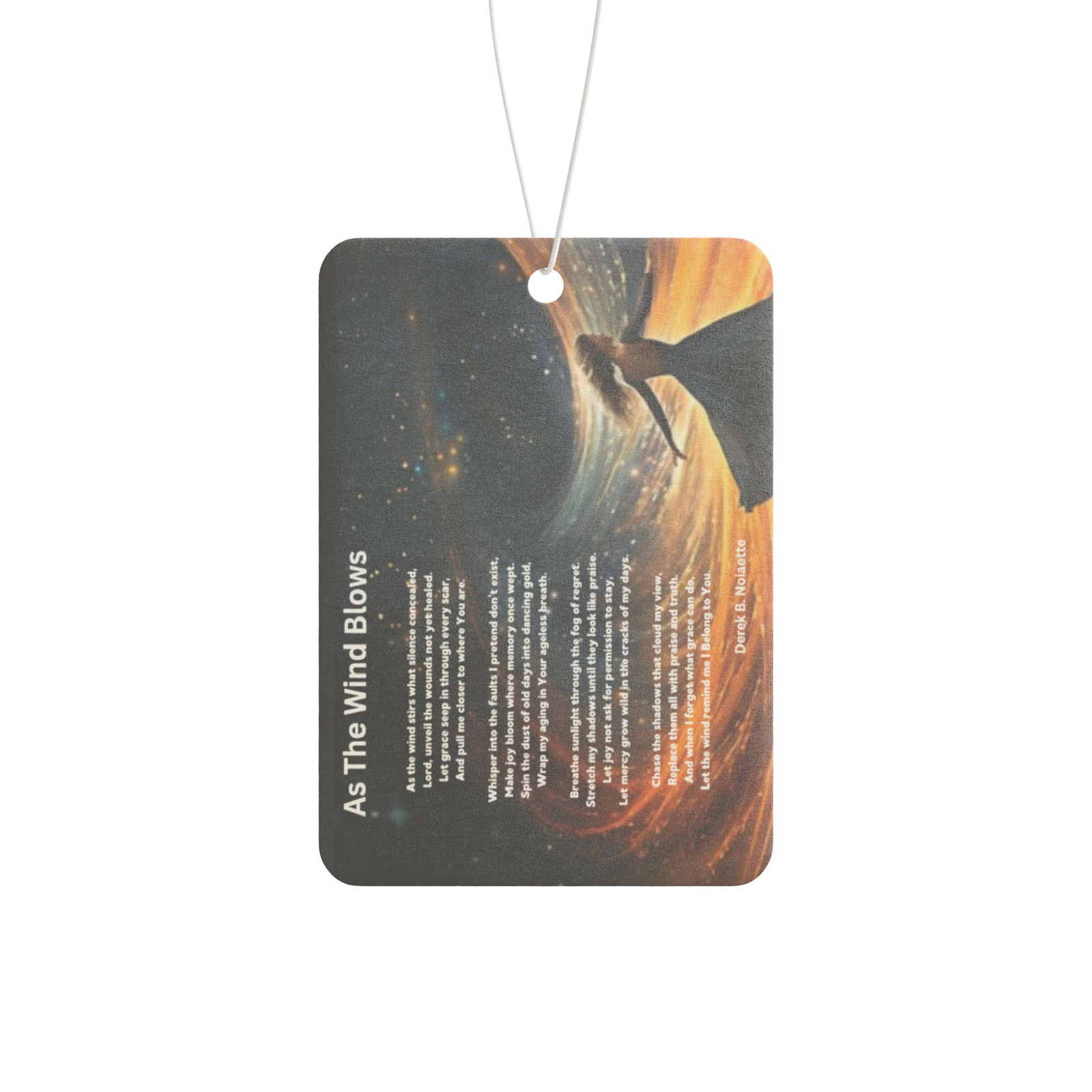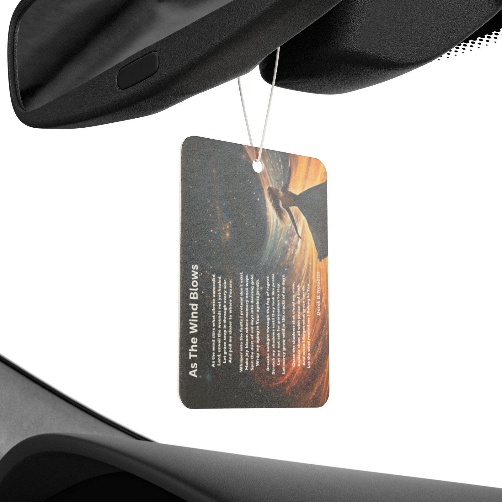 Printed alongside the image is the original poem “As the Wind Blows” by Derek B. Noisette, a 14-line spiritual reflection that stirs the heart and anchors the soul. Whether you’re commuting, cruising, or sitting still in a parking lot, this scented accessory reminds you to release fear, reclaim joy, and remember whose you are.