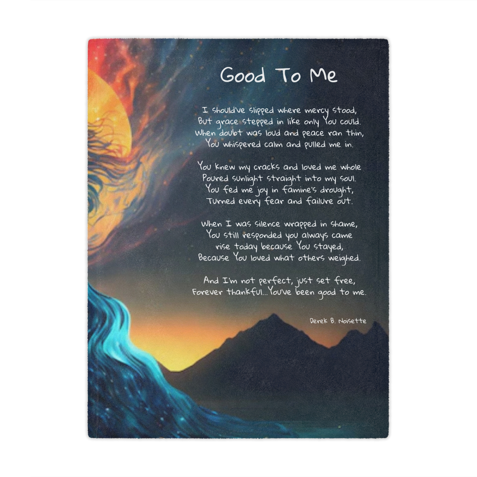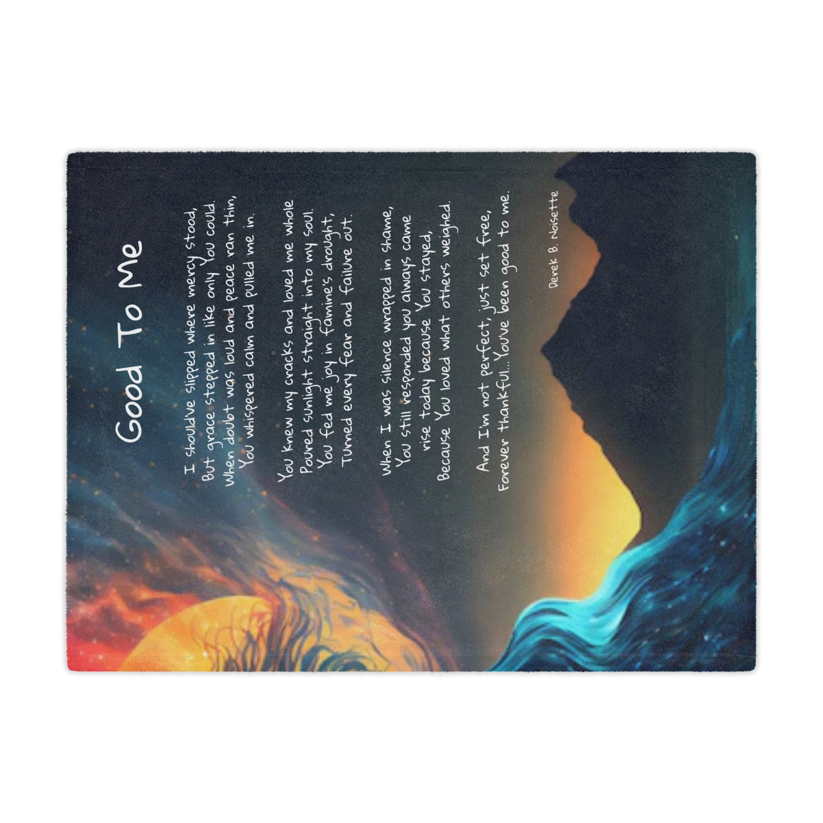 Features the entire “Good to Me” poem by Derek B. Noisette, reflected across a breathtaking horizon