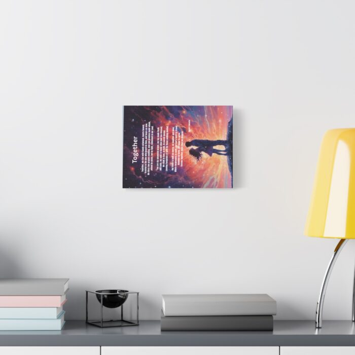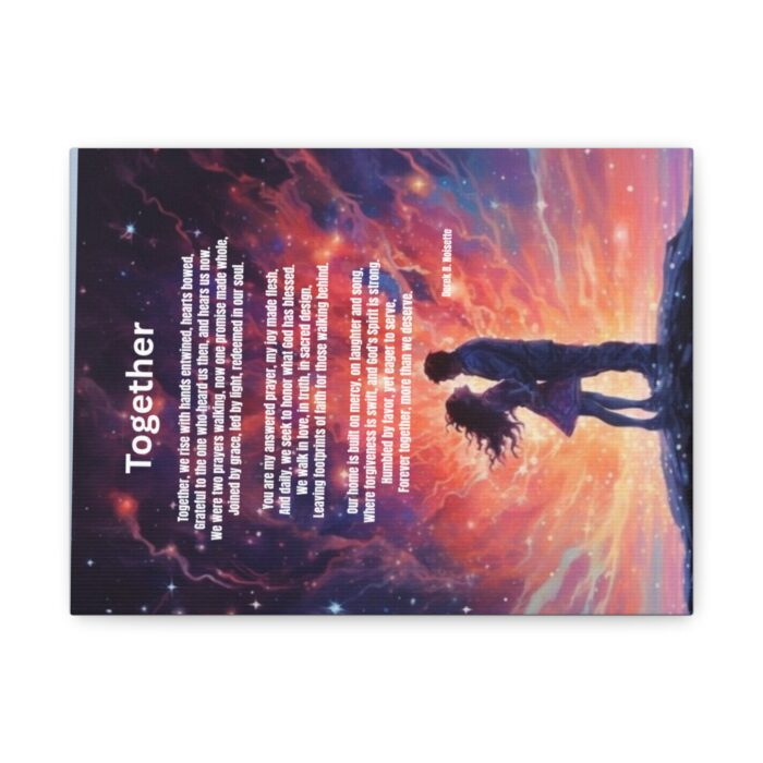 From the Praise 8 Collection comes a canvas print that radiates love, purpose, and divine alignment. The artwork captures a husband and wife standing and facing each other within a whirlwind of vivid colors, the energy of their union alive and sacred. Above them, softly woven into the sky, is the full poem Together by Derek B. Noisette, written like a promise sent from heaven. This canvas isn’t just a piece of art, it is a visual testimony that love anchored in God becomes more than a relationship; it becomes a living legacy.