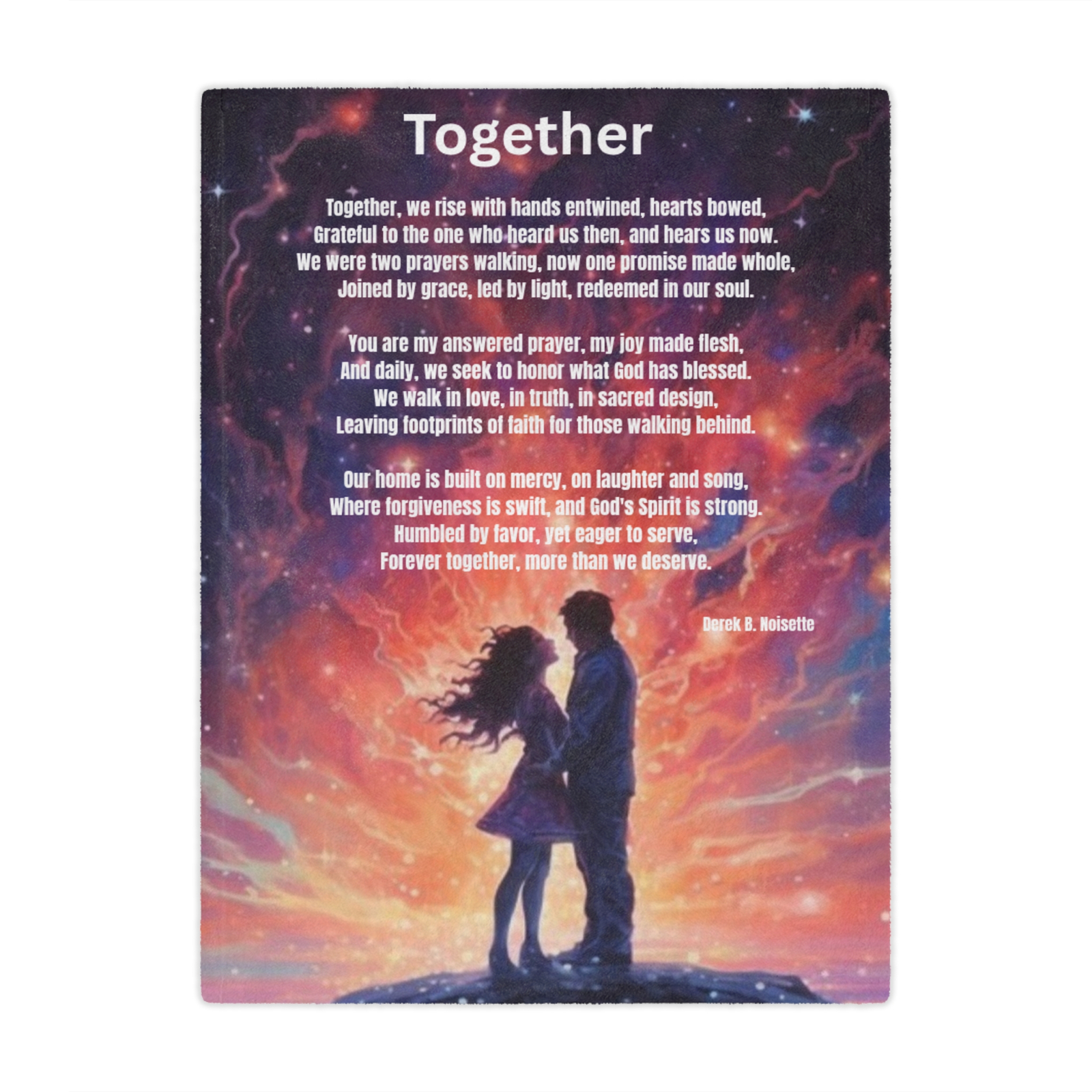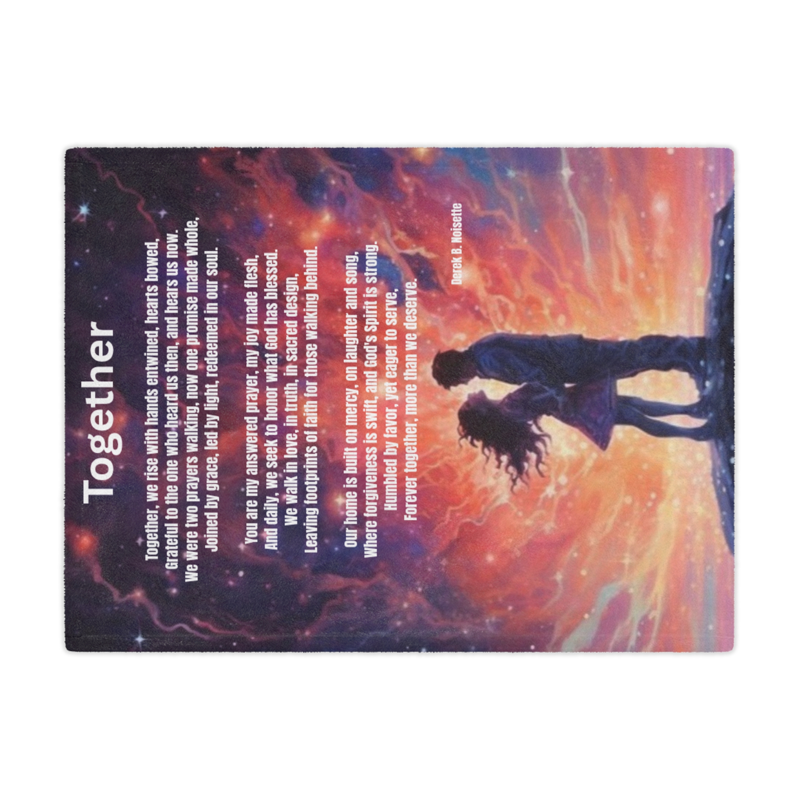 From the Praise 8 Collection comes a Minky blanket designed to do more than warm your body, it’s made to wrap your soul in faith, gratitude, and togetherness. The design features a husband and wife standing face to face in the middle of a whirlwind of color, their posture calm and connected, a reflection of love shaped by prayer and built on grace. Floating above them, written in the sky, is the full poem Together by Derek B. Noisette, a heartfelt declaration of unity, divine purpose, and legacy rooted in God.