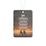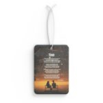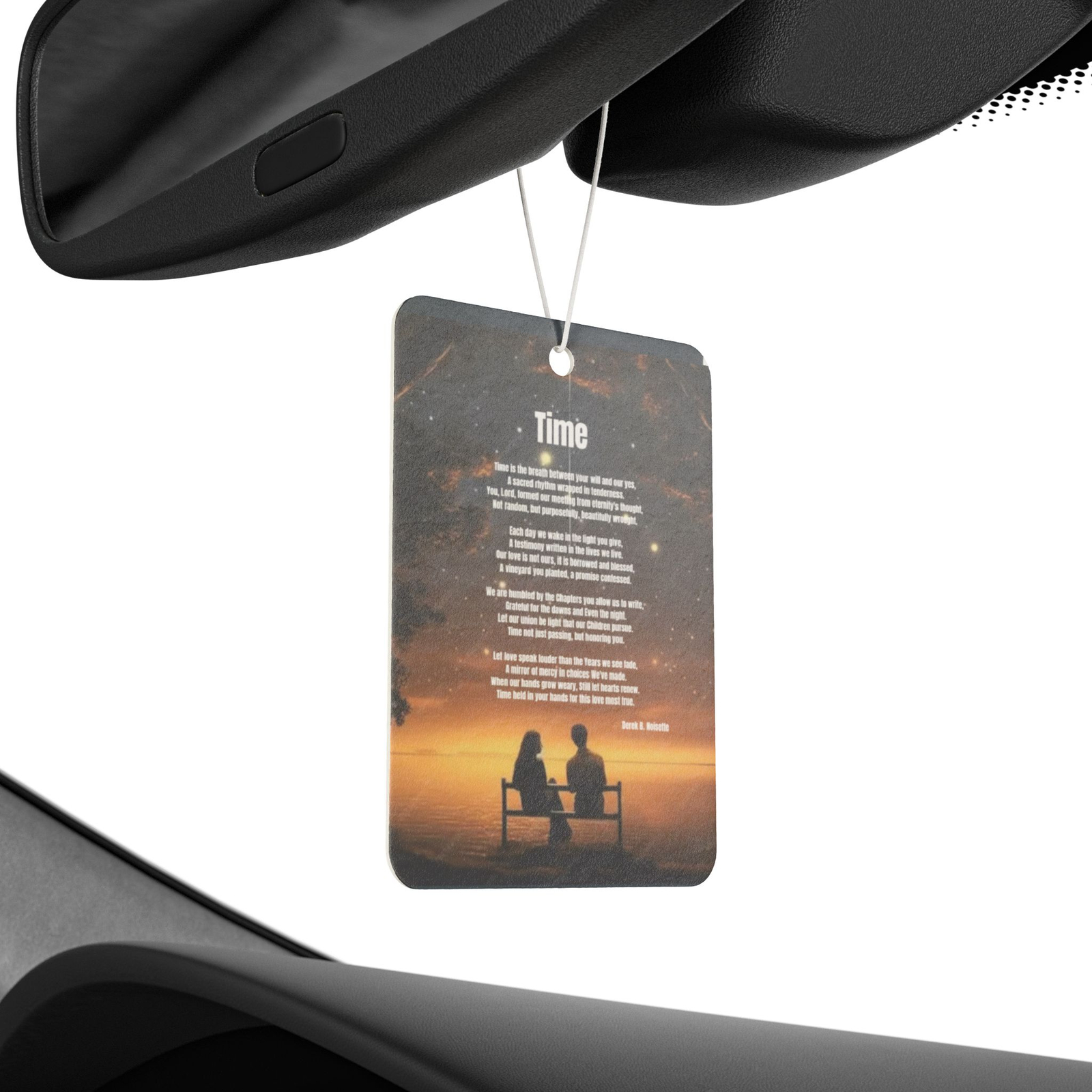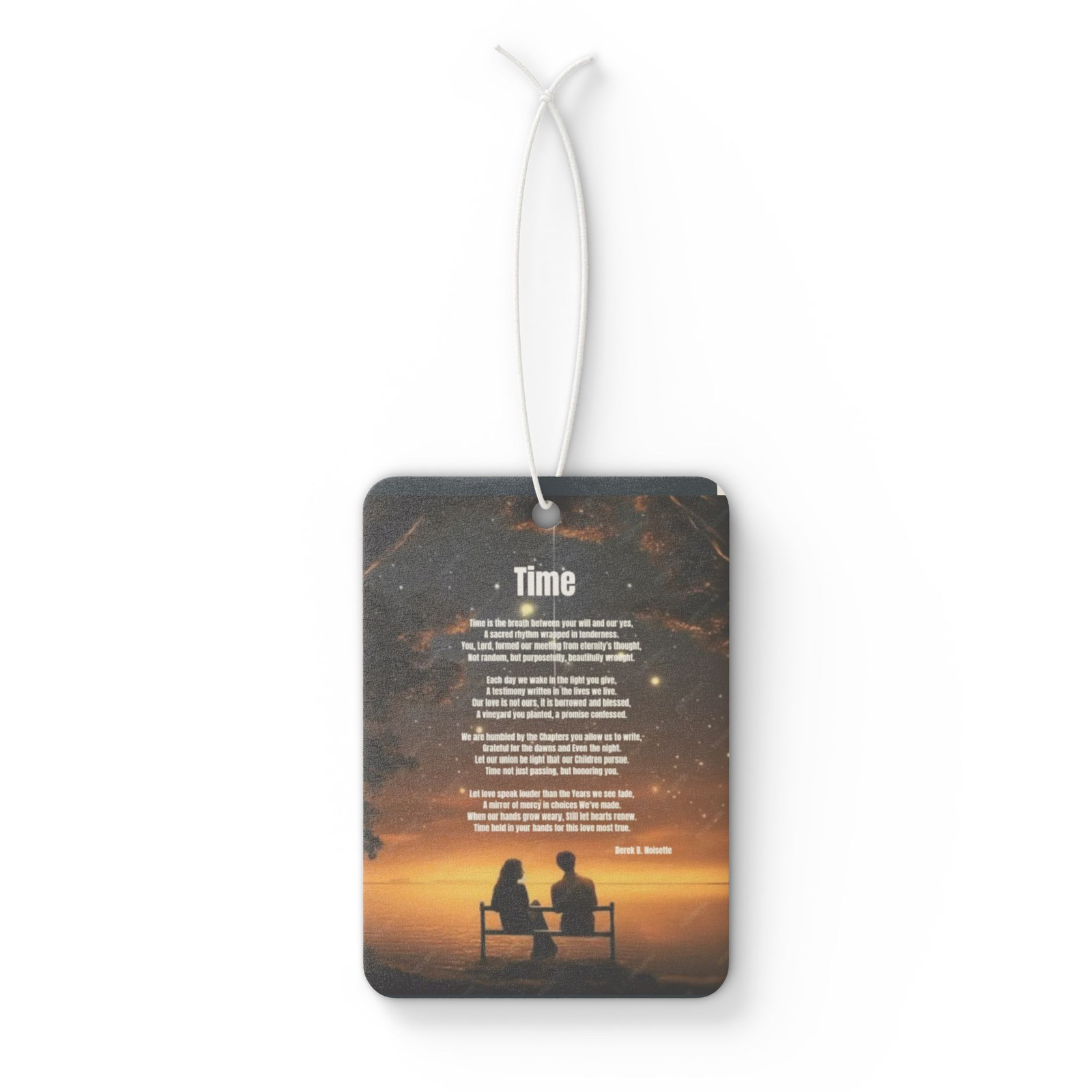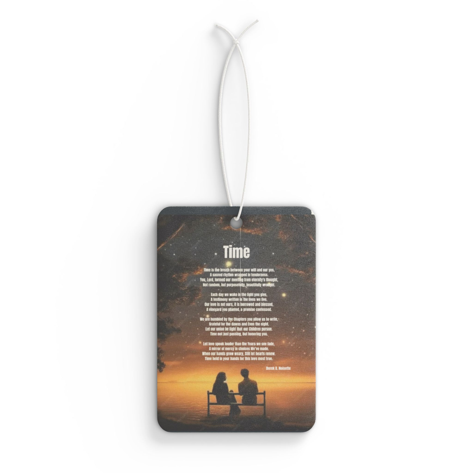 From the Praise 9 Collection comes a spiritually meaningful car air freshener that turns even the shortest drive into a sacred pause. The artwork features a serene scene: a husband and wife sitting quietly together on a park bench beneath a starlit sky, their hearts aligned in quiet reflection. Above them, gently written among the stars, is the full poem Time by Derek B. Noisette, a deeply moving meditation on God’s hand in love, legacy, and the gift of shared moments.