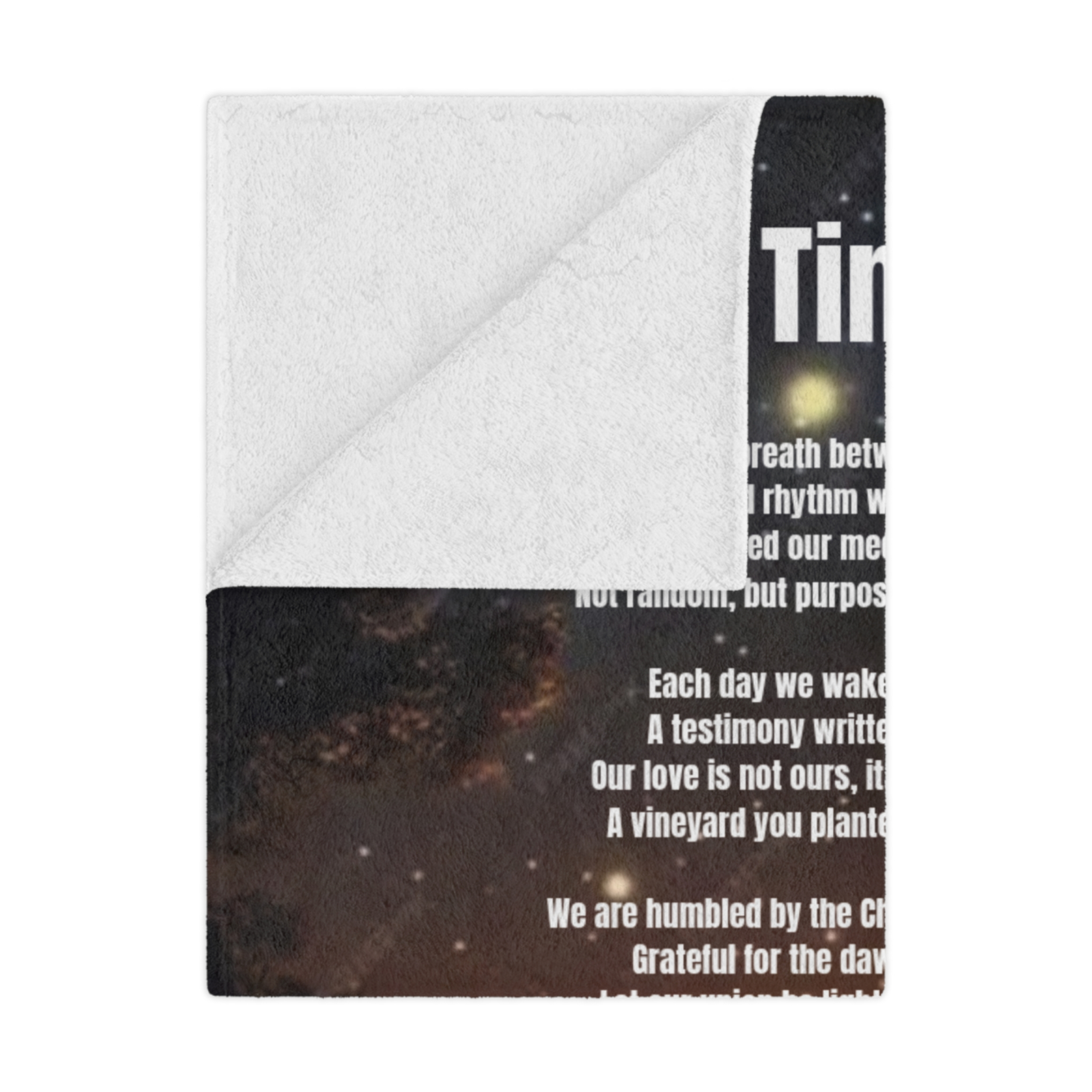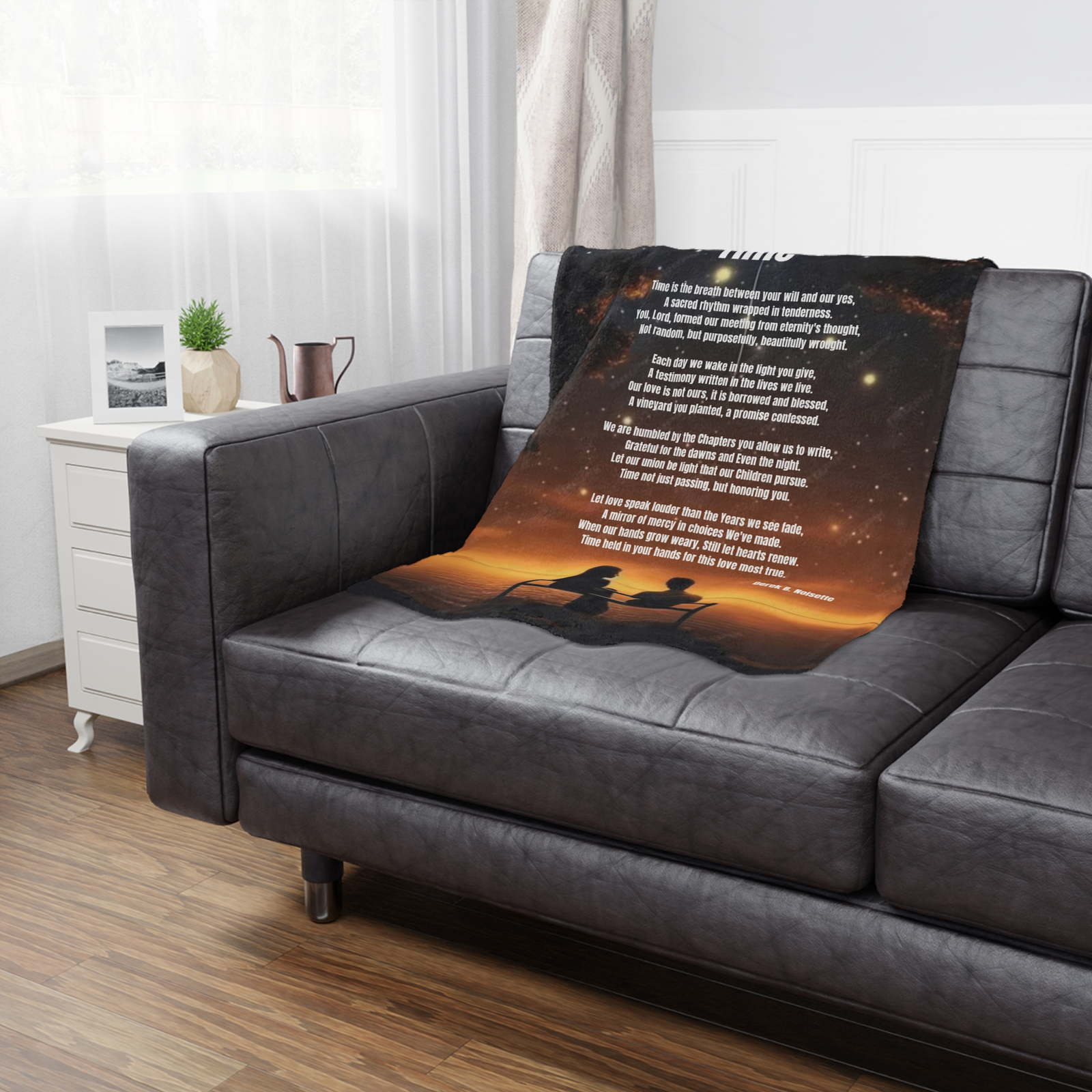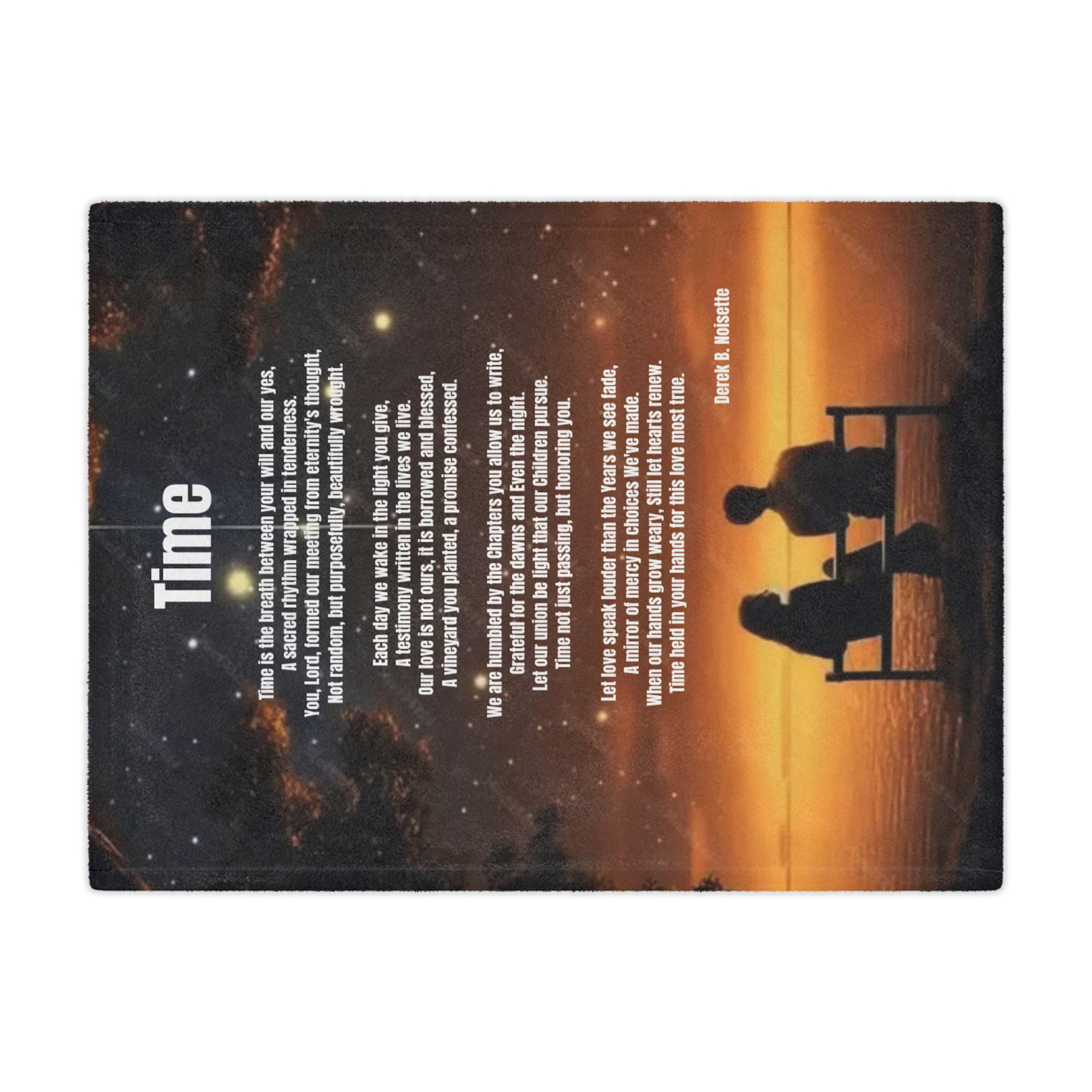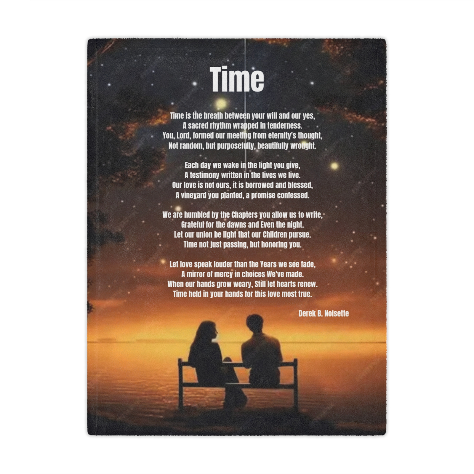 From the Praise 9 Collection comes a Minky blanket woven not only with softness, but with sacred meaning. The design shows a husband and wife sitting together on a park bench beneath a sky of stars, resting in the peace of shared days and thankful hearts. Above them, written across the celestial canvas, is the full poem Time by Derek B. Noisette, an offering of praise, purpose, and partnership wrapped in grace.