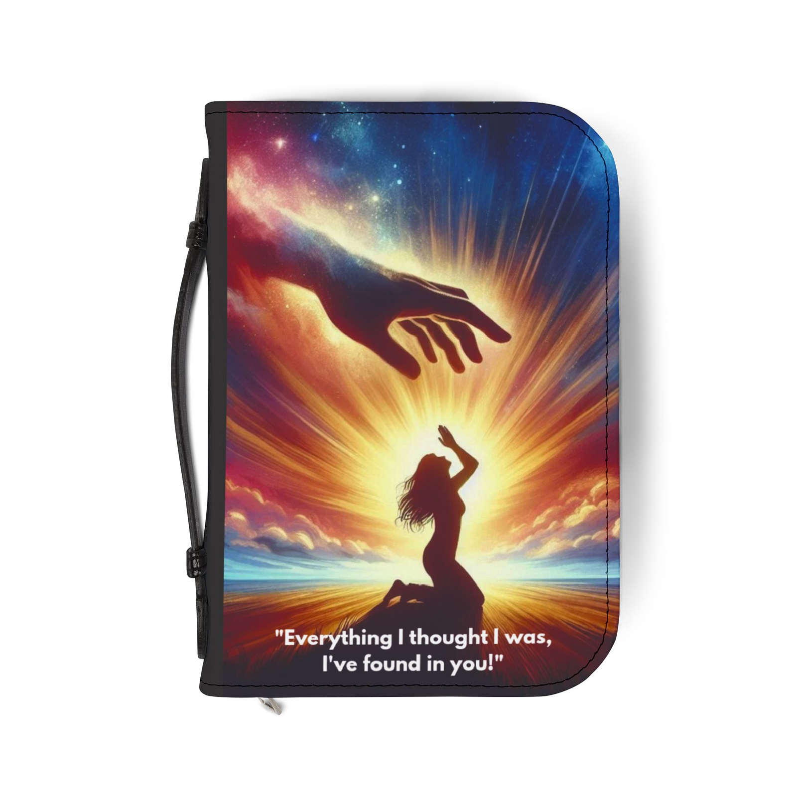 From the Praise Collection comes a powerful and soul-stirring Bible cover that captures the heart of worship and divine connection. The design features a woman on her knees in a posture of praise, arms lifted in surrender, while a majestic hand reaches down from the clouds above, a sacred image symbolizing God’s comfort, strength, and presence in our most vulnerable moments.