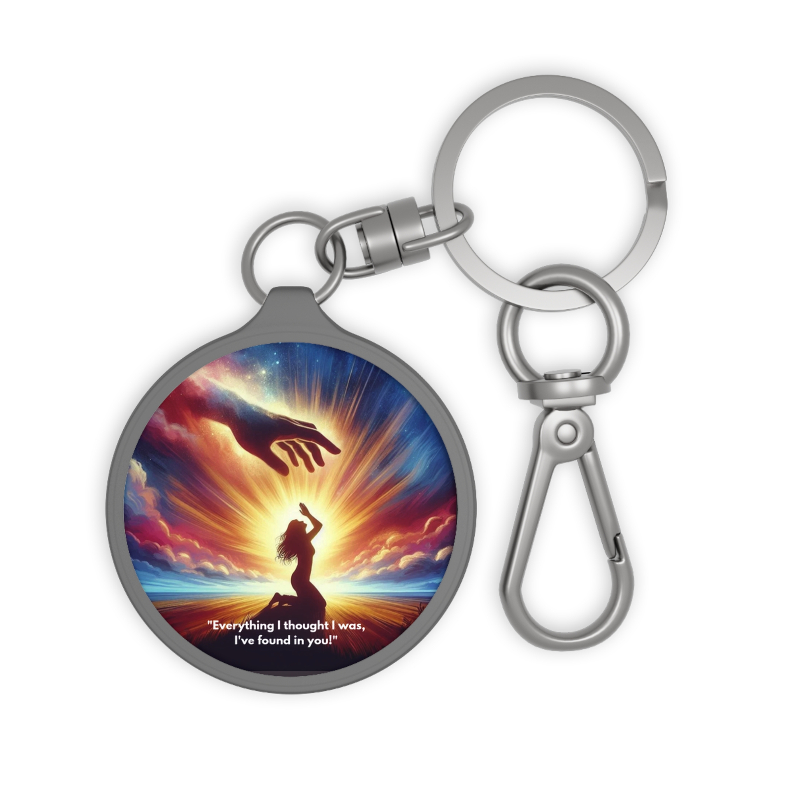 Carry a piece of your faith wherever you go with this beautifully crafted Personalized Keyring Tag from the Praise Collection. Featuring a graceful design of a woman kneeling in praise while a majestic hand reaches down from the clouds above, this keyring is more than just an accessory, it’s a declaration of worship and divine connection.