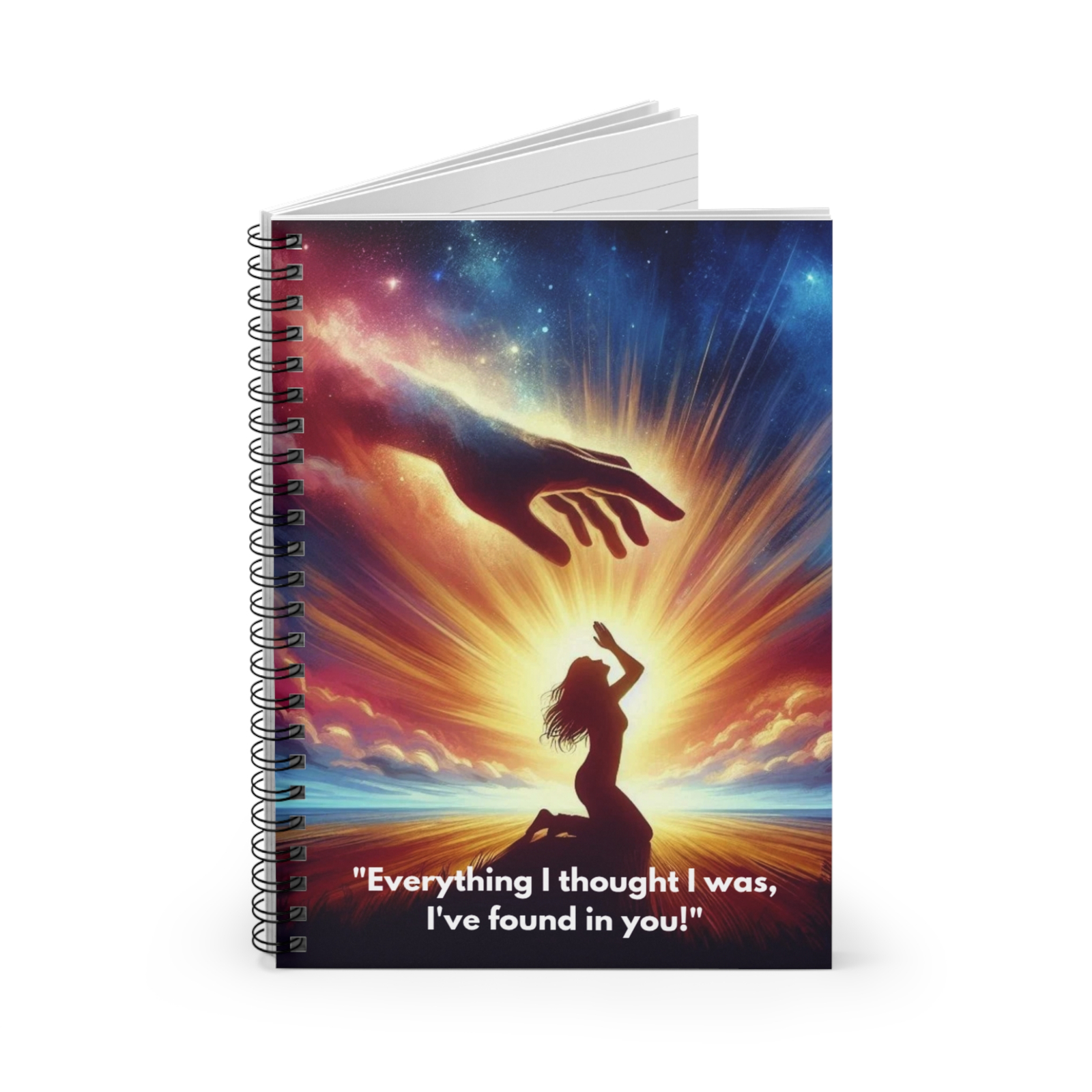 Let inspiration flow from above with the Praise Spiral Notebook, a spiritually uplifting space to record your thoughts, prayers, dreams, and daily reflections. The captivating cover artwork features a powerful image: a woman giving praise, as a hand extend from radiant clouds, reaching in worship, strength, and surrender. It’s a daily reminder that gratitude and grace can lift us higher.