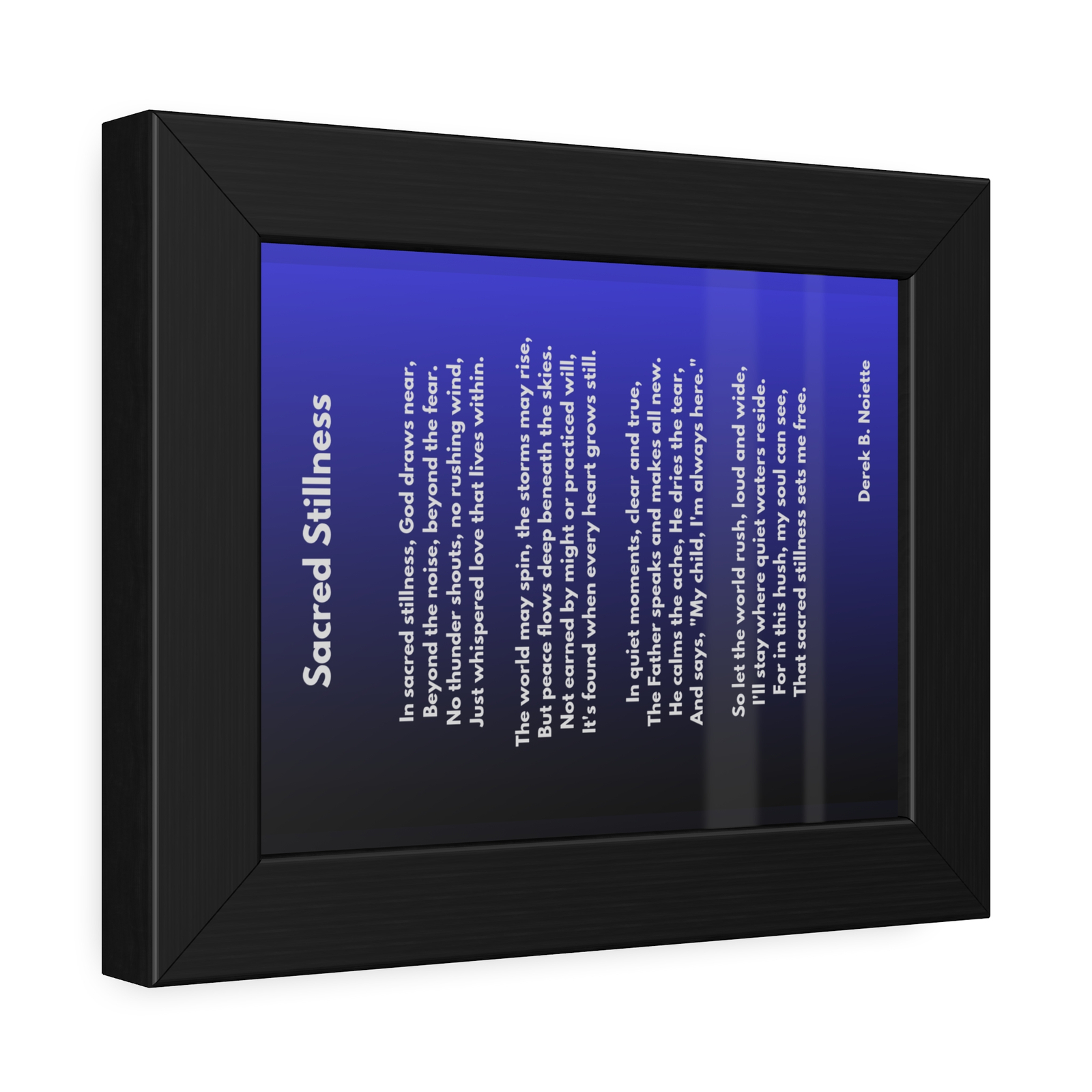 Bring calm to your space with Sacred Stillness, a moving piece from the Praise Collection featuring an original poem by Derek B. Noisette. Set against a striking blue and black background, this framed Christian wall art blends visual elegance with spiritual depth, perfect for any room in need of God’s gentle presence.
