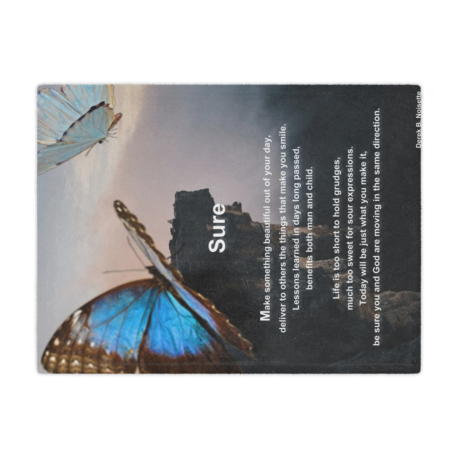 This luxuriously soft plush blanket offers more than warmth, it’s a statement of faith and a touch of heaven here on earth. Featuring the delicate image of a beautiful butterfly in flight, paired with Derek B. Noisette’s inspiring poem “Sure,” this blanket is a comforting reminder that you and God are walking in alignment, through every moment, every challenge, and every triumph.