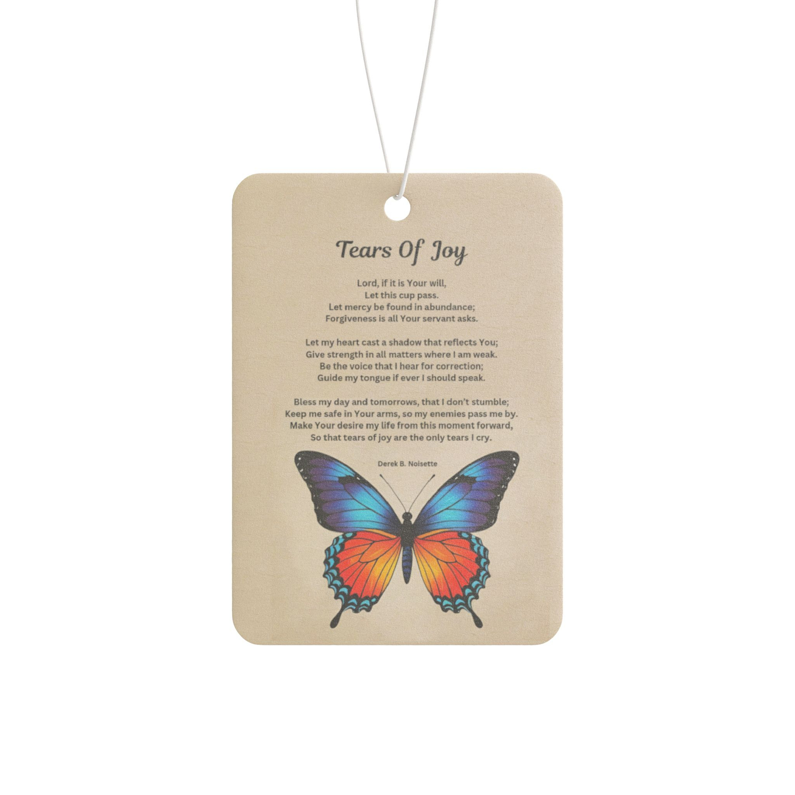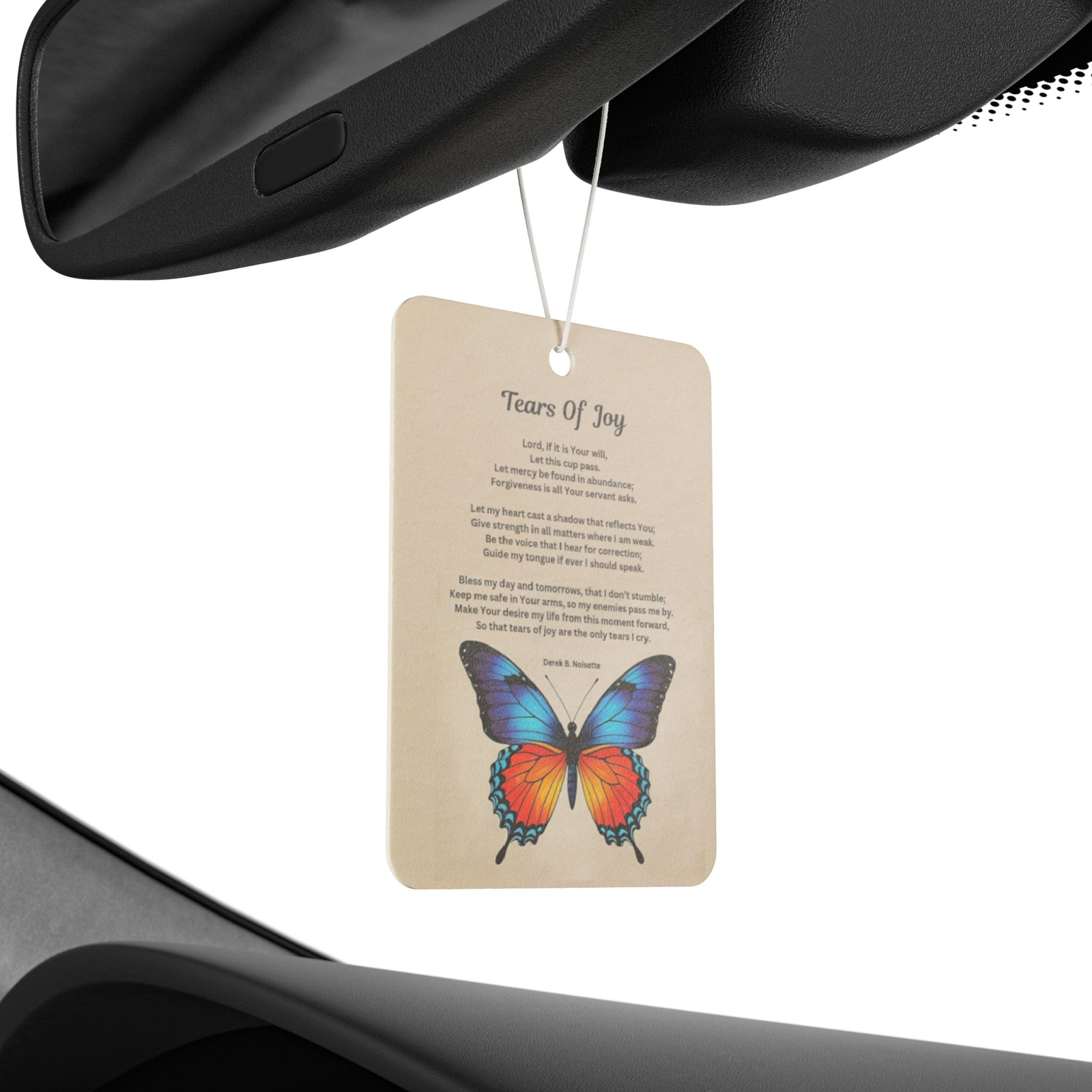 Featuring the heartfelt poem Tears of Joy printed in full color on both sides, this inspirational air freshener brings spiritual calm to every mile.