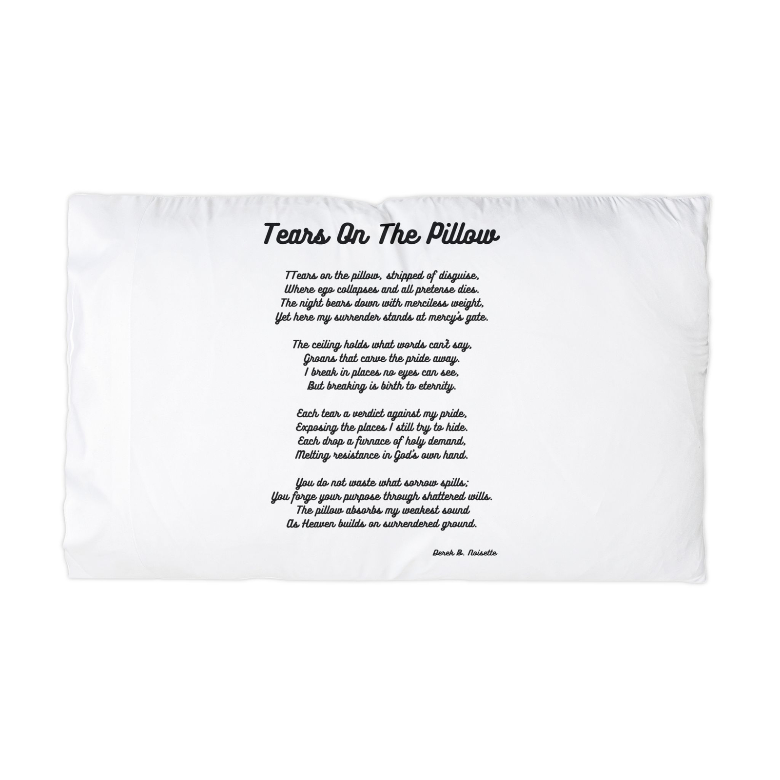 A soft, lightweight microfiber pillowcase printed on both sides with a centered, script-style poem titled “Tears On The Pillow.” The fine polyester weave feels smooth against skin and dries quickly, keeping warmth and comfort through the night. The all-over, double-sided print remains vibrant wash after wash; a neat 3.25″ hemmed cuff gives a tailored edge. This pillowcase slips over a standard pillow and brings a quietly intimate, reflective touch to a bedroom or reading nook.