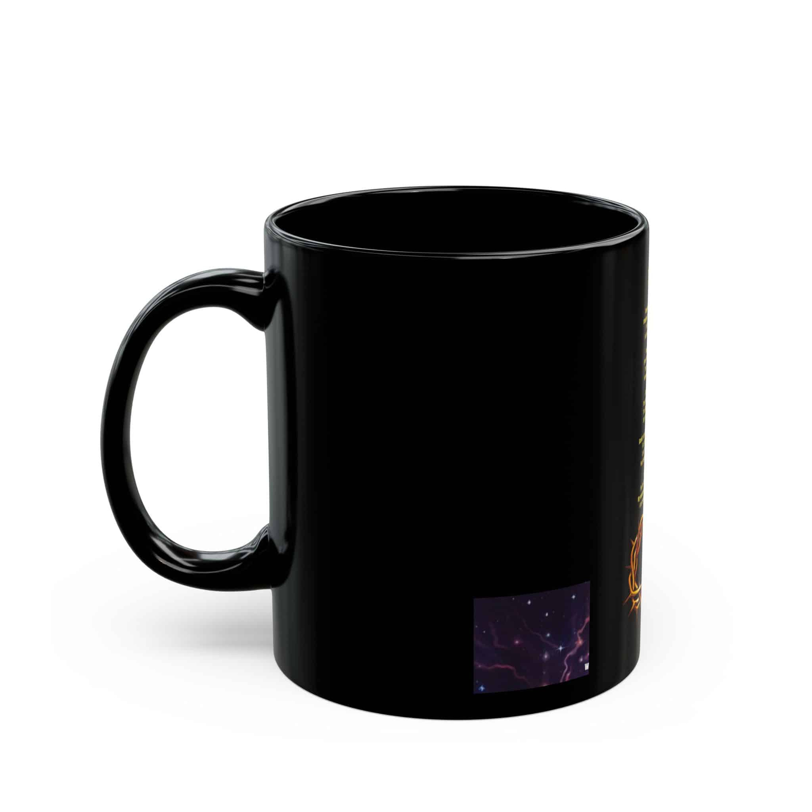 Crafted from glossy black ceramic with a high-resolution, fade-resistant print, this Praise mug is available in 11 oz and 15 oz sizes. It is microwave safe, dishwasher safe, BPA-free, and lead-free. To preserve the integrity of the artwork, gentle hand washing with mild soap is recommended.