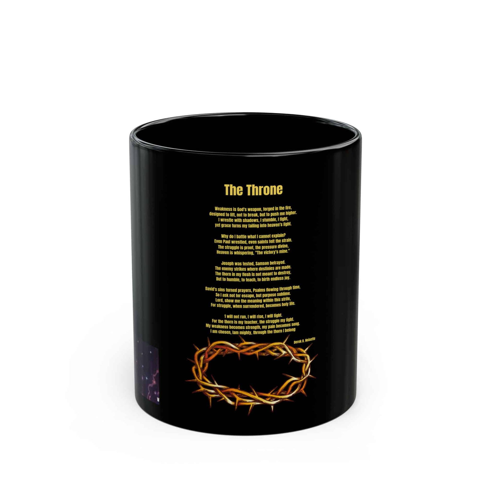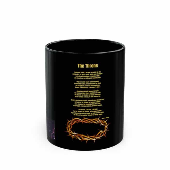 From the Praise Collection comes a black ceramic mug that holds more than your morning coffee, it holds courage, grace, and the reminder that every trial has divine purpose. The artwork wraps beautifully around the cup, depicting a quiet scene of reflection, a crown of thorns. Above is the full poem “The Thorn” by Derek B. Noisette, a powerful reflection on weakness, faith, and the strength that only God can provide.