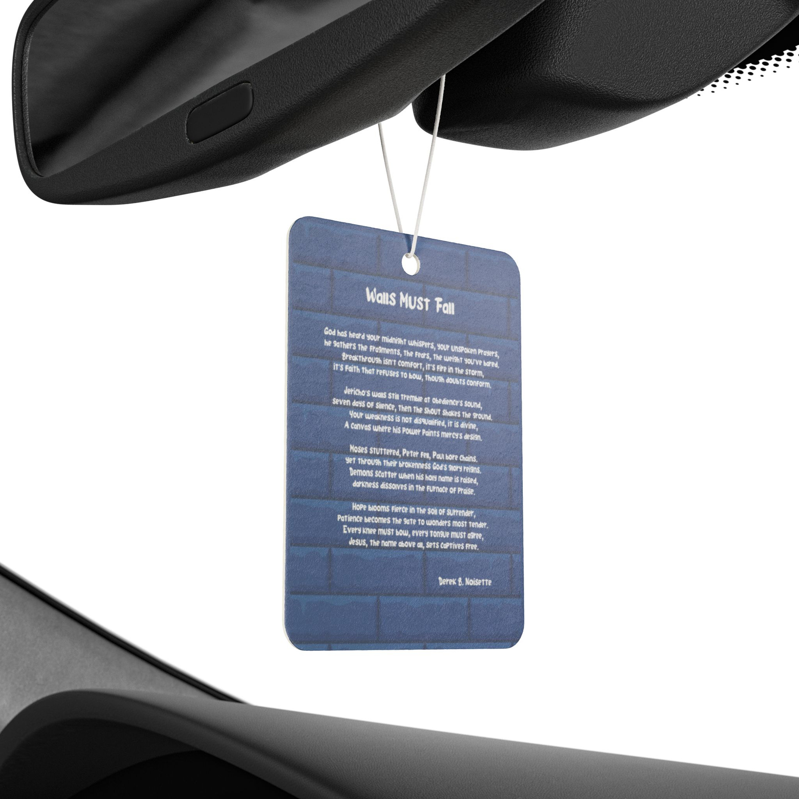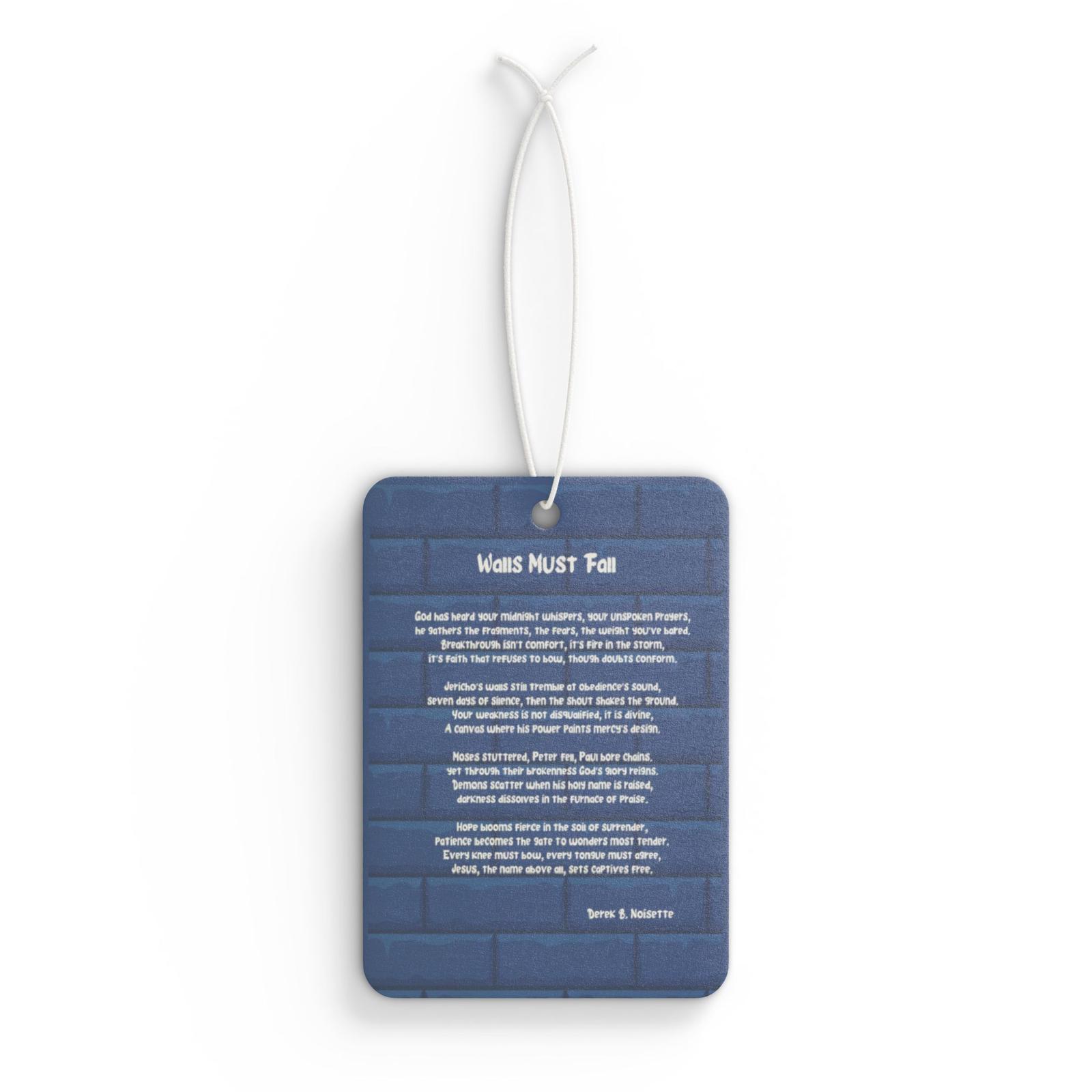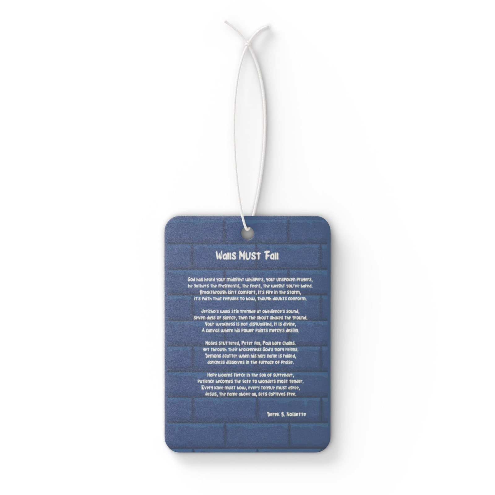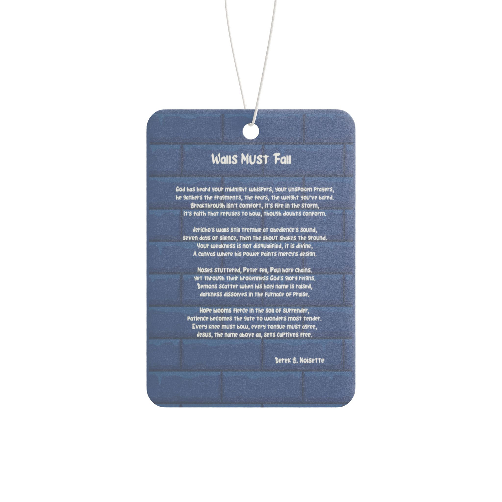 From the Praise Collection at Joy’s Book Corner comes the Walls Must Fall car air freshener, designed to turn every drive into a moving declaration of faith. Featuring a bold blue wall with the words “Walls Must Fall” in graffiti style, this double-sided accessory reminds you that God’s power breaks every wall in your life and victory comes through obedience and trust.