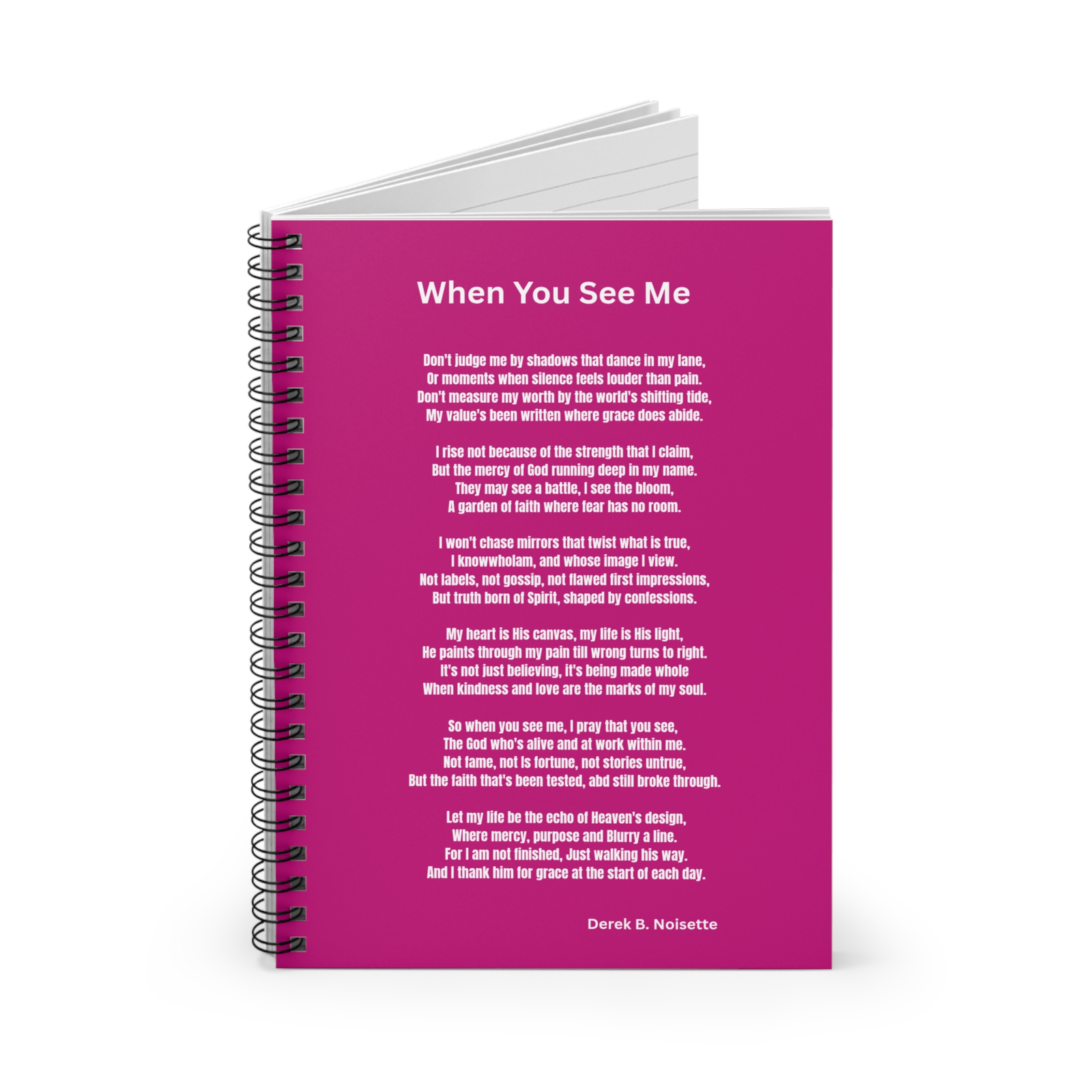 This spiral notebook is more than just a space for thoughts, it’s a mirror of grace, strength, and redemption. Featuring a heartfelt cover from the Praise Collection, it visually and spiritually echoes the message of the original poem “When You See Me” by Derek B. Noisette.