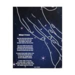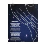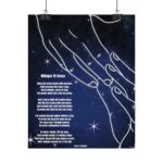 A rolled art poster that brings a quiet, starlit moment into any room. The design pairs a deep navy, galaxy-style background with delicate, continuous-line hands reaching toward one another, punctuated by soft starbursts and a short, contemplative poem. Printed with choices of rich giclée, semi-gloss, or matte papers, the print keeps intense colors and fine detail—whether you want a textured, painterly feel or a crisp photographic finish. Shippped rolled for safe delivery, this poster slips easily into frames or clips and settles into bedrooms, reading nooks, studios, or altars where gentle reflection matters.
